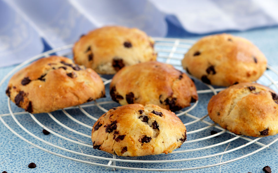 Προσθέτουμε σιγά-σιγά το αλεύρι και το μπέικιν πάουντερ. Οταν ομογενοποιηθεί, ενσωματώνουμε τις ψηφίδες σοκολάτας. Θα πρέπει να έχουμε μια μαλακή ζύμη που να μην κολλάει στα χέρια μας.