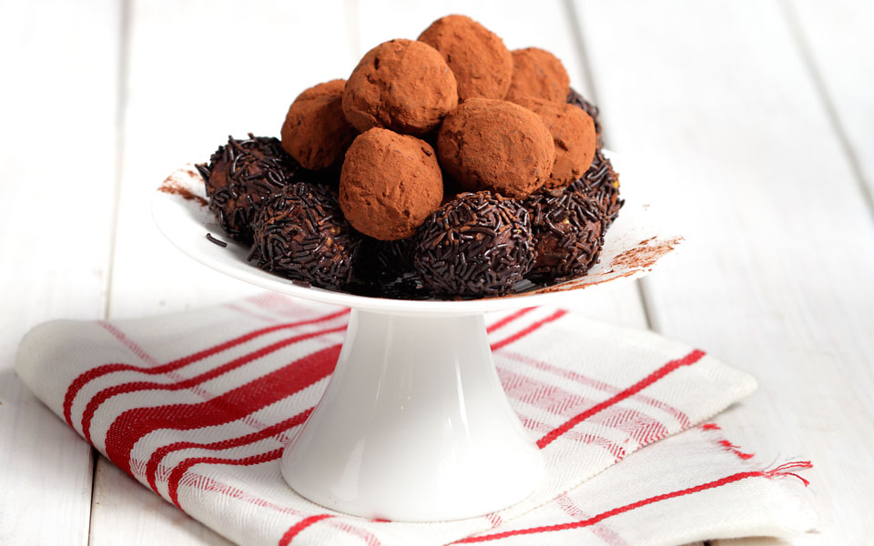 Το πλάθουμε σε ισομεγέθη τρουφάκια. Ρολάρουμε τα μισά τρουφάκια σε μπολάκι που έχουμε γεμίσει με το κακάο και τα άλλα μισά στο μπολάκι με την τρούφα.