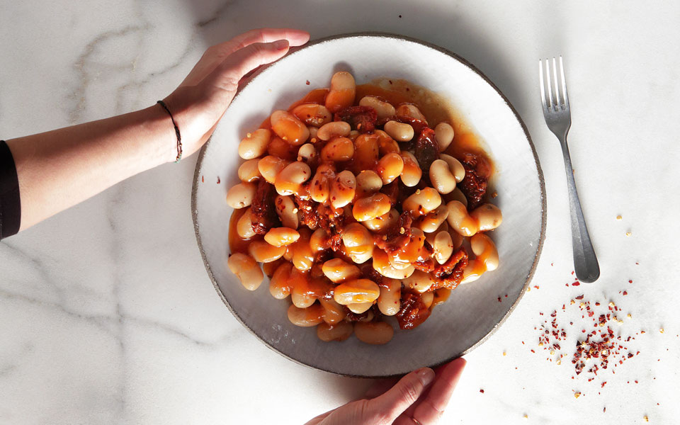 Αφήνουμε να πάρουν μια βράση και προσθέτουμε τους γίγαντες. Σκεπάζουμε και σιγομαγειρεύουμε για 20 λεπτά, μέχρι να μελώσει η σάλτσα.