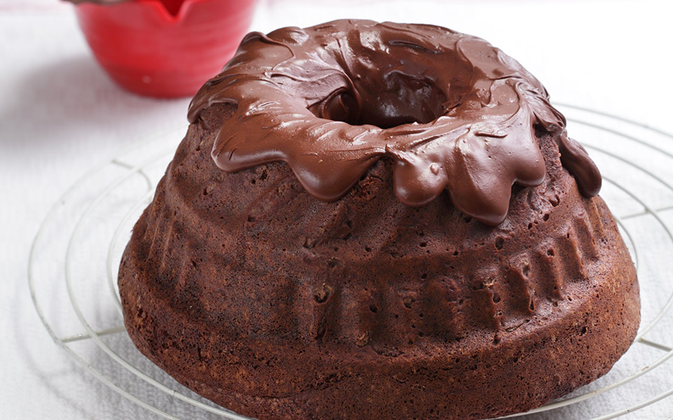 Προθερμαίνουμε τον φούρνο στους 180° C. Βουτυρώνουμε και αλευρώνουμε μια φόρμα του κέικ με τρύπα στη μέση, διαμέτρου 26 – 28 εκ.