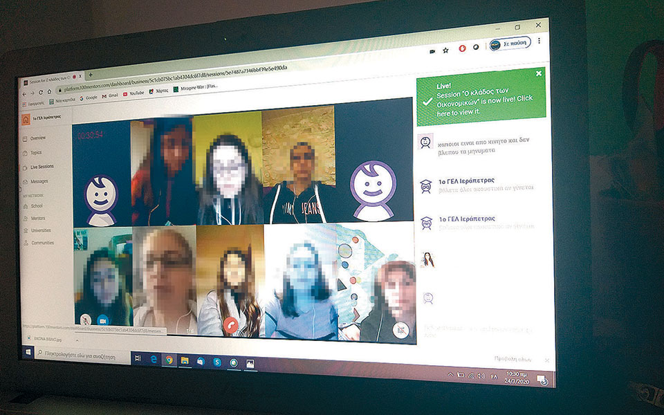 Και πράγματι, η πρώτη διαδικτυακή συνάντηση πραγματοποιήθηκε την πρώτη κιόλας ημέρα που έκλεισαν τα σχολεία. Το προηγούμενο πρωί είχαν επικοινωνήσει με τη Χριστίνα Λάιου, καθηγήτρια αγγλικών στο ΓΕΛ Αμφίκλειας, για να οργανωθούν. Της ζήτησαν να συγκεντρώσει τα emails των μαθητών για να συνδεθούν όχι πλέον ως τάξη αλλά από τα σπίτια τους. «Τα παιδιά ήταν ακόμη χαρούμενα, θεωρούσαν πως έχουμε κλείσει για λόγους καθαρά προληπτικούς», λέει η κ. Λάιου. Οι μαθητές συνδέθηκαν και συζήτησαν για ώρα με την κ. Νατάσσα Πανηγυράκη, σύμβουλο επιχειρήσεων, για διάφορα θέματα επαγγελματικού προσανατολισμού – ακόμα ο κορωνοϊός δεν είχε μπει στις συζητήσεις τους.