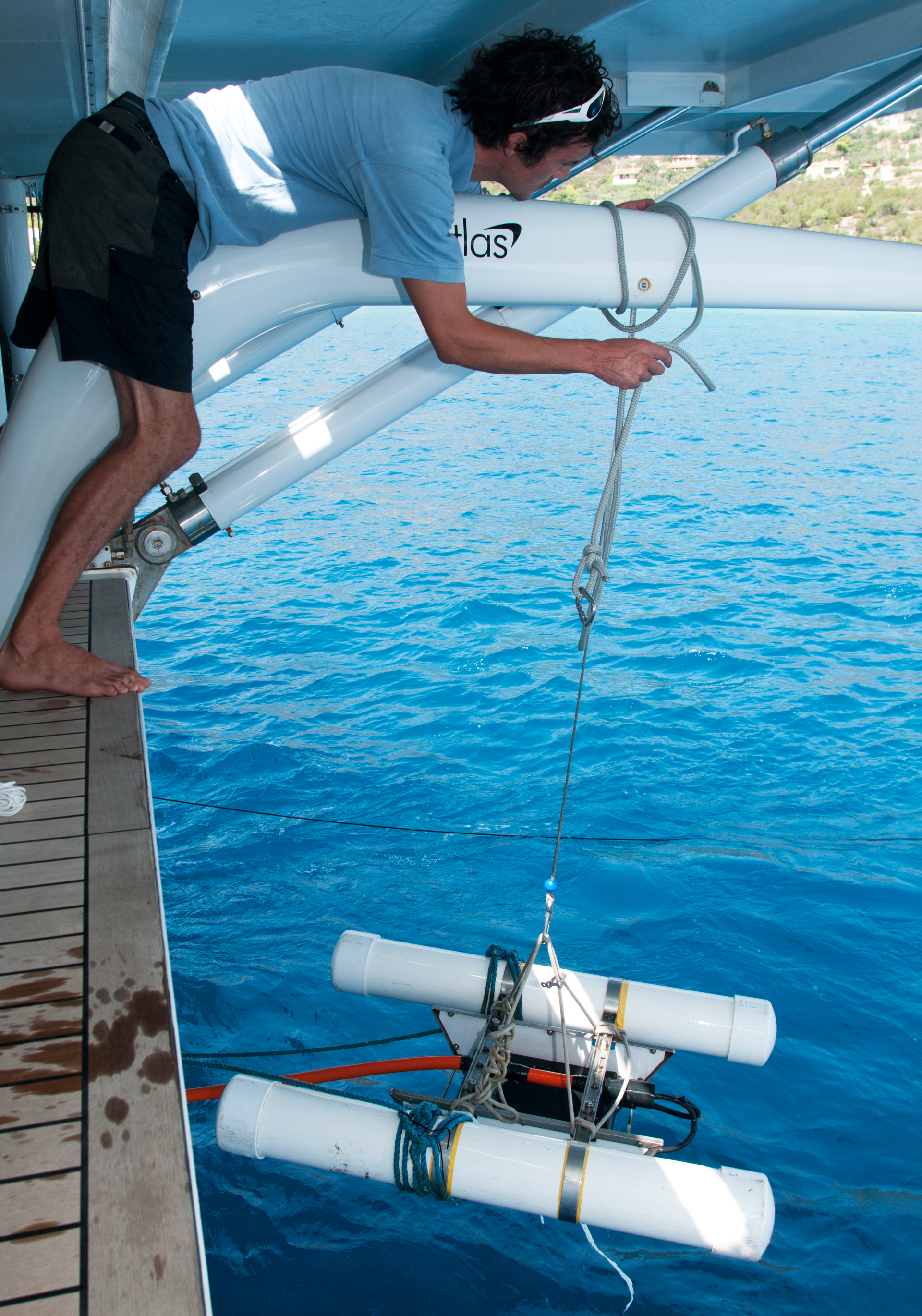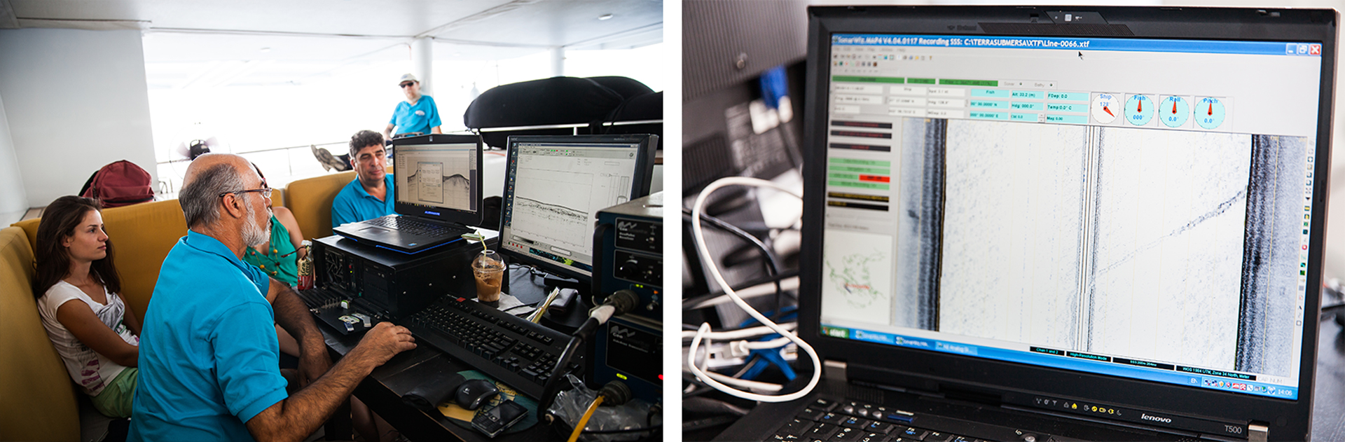 Το καταµαράν είναι έτοιµο να ξεκινήσει. Οι ερευνητές του ΕΛΚΕΘΕ έχουν ποντίσει στο πρυµναίο τµήµα του σκάφους ειδικά µηχανήµατα. Πρόκειται για έναν ηχοβολιστή πλευρικής σάρωσης που χαρτογραφεί το βυθό και έναν τοµογράφο υποδοµής πυθµένα που κάνει σεισµικές τοµές για να βρει τι υπάρχει από κάτω του. Ο επικεφαλής ∆ηµήτρης Σακελλαρίου, ειδικός στην υποθαλάσσια γεωλογία, παρακολουθεί τα πάντα µέσα από τις οθόνες.