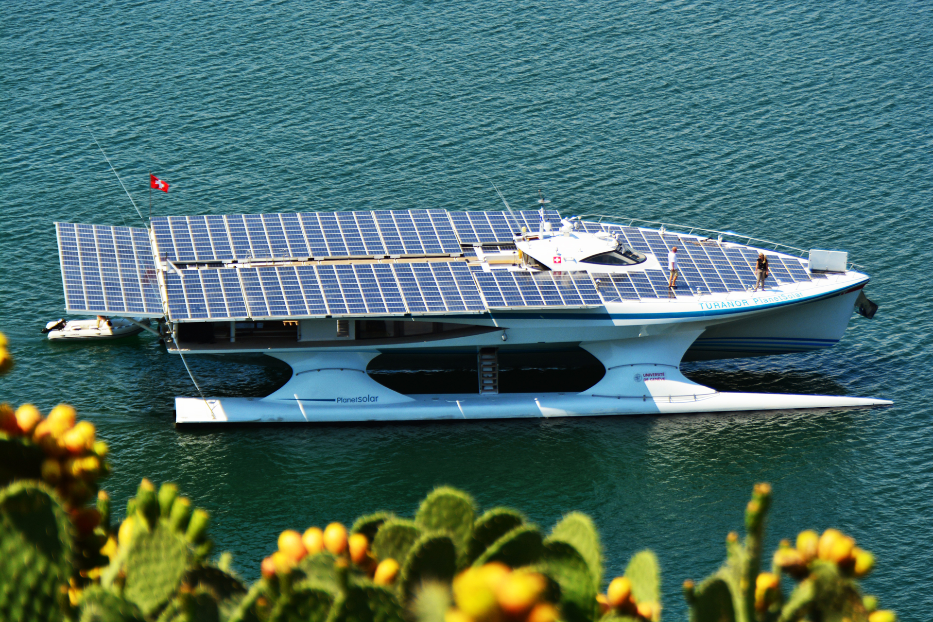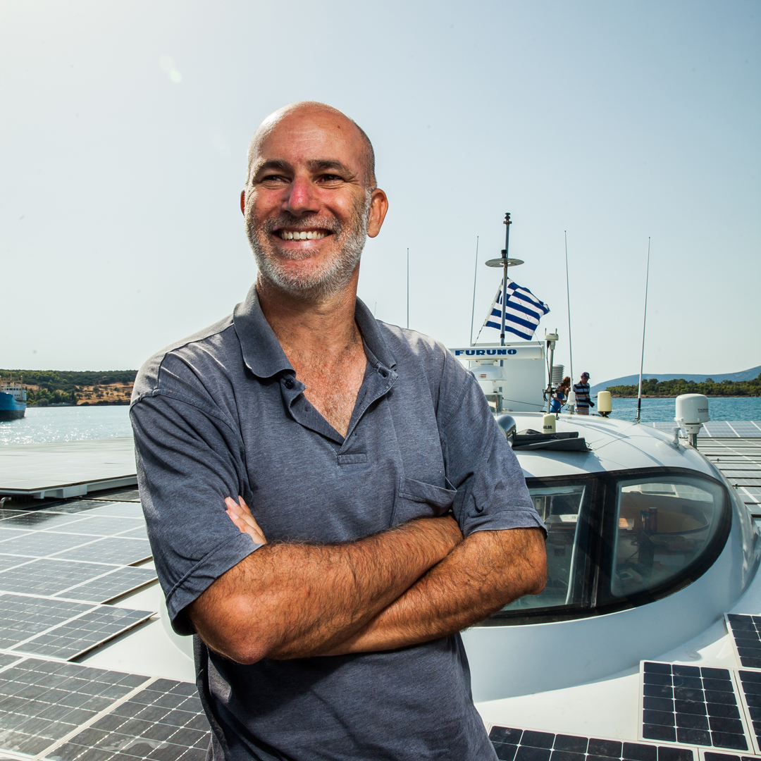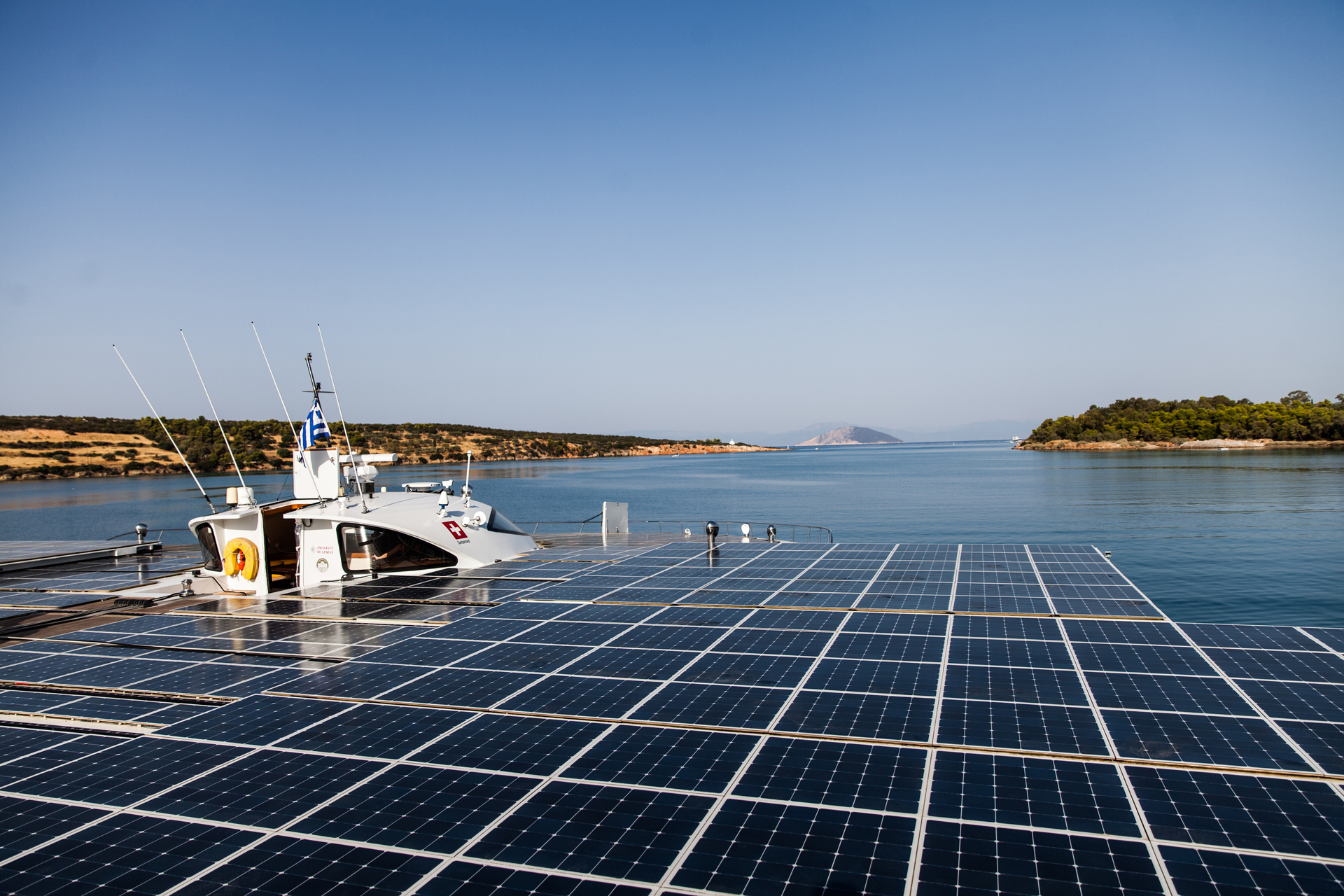 Η θάλασσα είναι ήρεµη και το καταµαράν γλιστρά στο νερό. Ο ήλιος δίνει ενέργεια στις µπαταρίες και εκείνες µε τη σειρά τους κινούν αθόρυβα το σκάφος.