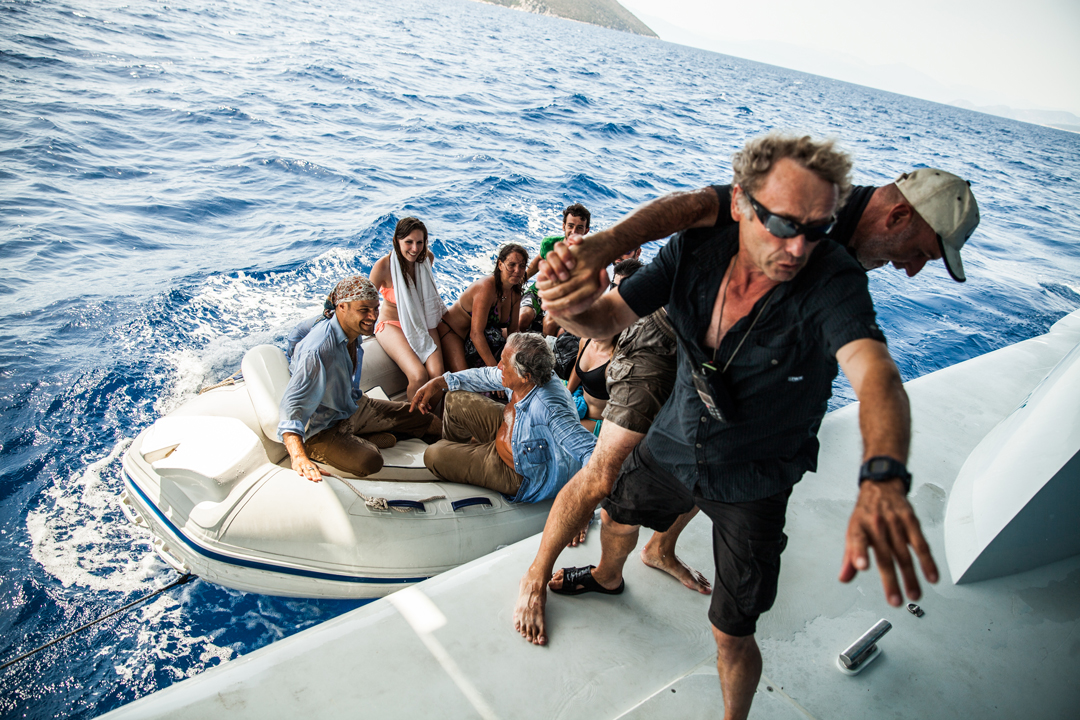Στριµωχνόµαστε στη γάστρα, Ελληνες και ξένοι δηµοσιογράφοι, η αρχαιολόγος - δύτρια της Εφορείας Εναλίων Αρχαιοτήτων ∆έσποινα Κουτσούµπα, ο καθηγητής Αρχαιολογίας του Πανεπιστηµίου της Γενεύης Ζιλιέν Μπεκ και ερευνητές του Ελληνικού Κέντρου Θαλασσίων Ερευνών.