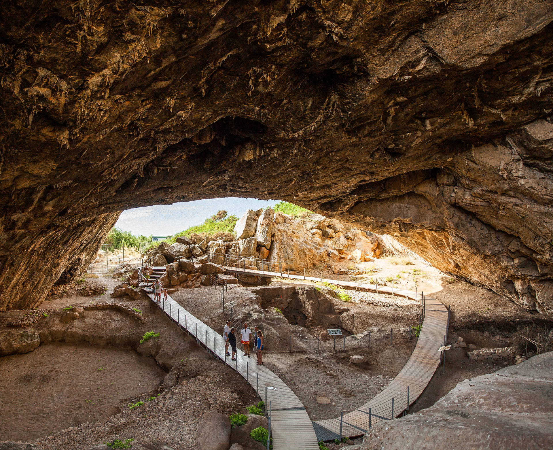 Μετά το 1965 έχει τεκµηριωθεί ότι υπάρχουν ίχνη ανθρώπινης δραστηριότητας από το 35000 π.Χ. Κατοικήθηκε κυρίως κατά την Ανώτερη Παλαιολιθική εποχή (40000-10000 π.Χ.), στην οποία «συναντήθηκαν» ο άνθρωπος του Νεάντερταλ µε τον Homo Sapiens, τη Μεσολιθική (9000-7000 π.Χ.) και τη Νεολιθική περίοδο (7000-3000 π.Χ.). Στις δύο πρώτες υπήρξε καταφύγιο µετακινούµενων κυνηγών, τροφοσυλλεκτών και ψαράδων (έχουν βρεθεί έως και κόκαλα από τόνους), οι οποίοι χρησιµοποιούσαν εργαλεία φτιαγµένα από σκληρές και αιχµηρές πέτρες, όπως ο πυριτόλιθος και ο οψιανός. Στη Νεολιθική περίοδο, η κατοίκηση επεκτάθηκε στον παρακείµενο υπαίθριο χώρο, γεγονός που γνωρίζουµε από τα ευρήµατα: λεπίδες για δρεπάνια, µαχαίρια, αιχµές βελών, µυλόπετρες, τσεκούρια και αξίνες, αλλά και πολλά οστέινα, όπως αγκίστρια, σπάτουλες και σουβλιά, κοσµήµατα και αγγεία.