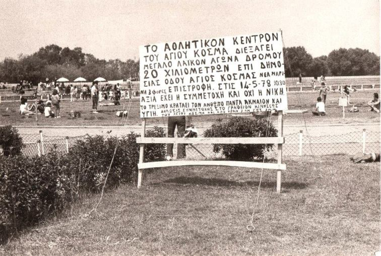 Ηταν Μάιος του 1978 όταν μια παρέα ερασιτεχνών δρομέων διοργάνωσε τον πρώτο μαζικό αγώνα δρόμου στην Ελλάδα, απόστασης 20 χλμ. στον Αγιο Κοσμά. Στην είσοδο του αθλητικού κέντρου, πάνω σε μια λαμαρίνα που είχε πέσει από μαρκίζα νυχτερινού κέντρου διασκέδασης, έγραψαν τότε: «Αξία έχει η συμμετοχή και όχι η νίκη. Το τρέξιμο κρατάει τον άνθρωπο πάντα ακμαίον και υγιή».