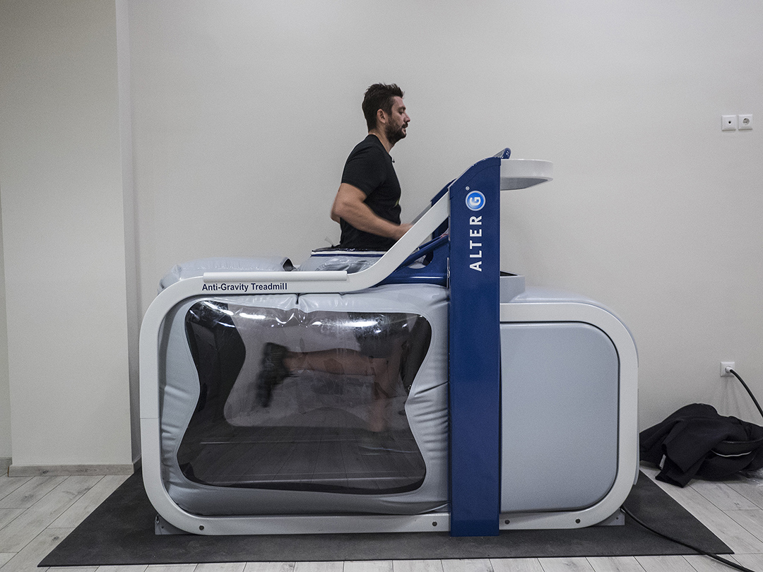 Ο Μάριος Κρητικός προπονείται σε διάδρομο αντιβαρύτητας για να αντιμετωπίσει έναν πρόσφατο τραυματισμό του.