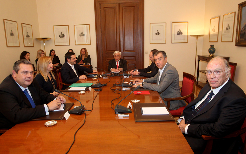 Επειτα από «μαραθώνιο» συζητήσεων ολοκληρώθηκε η σύσκεψη των πολιτικών αρχηγών στο Προεδρικό Μέγαρο, που διήρκεσε έξι περίπου ώρες. Βρέθηκε συμφωνία για το προσφυγικό, «αγκάθι» το ασφαλιστικό, ενώ συμφωνήθηκε και η αλλαγή του εκλογικού νόμου.