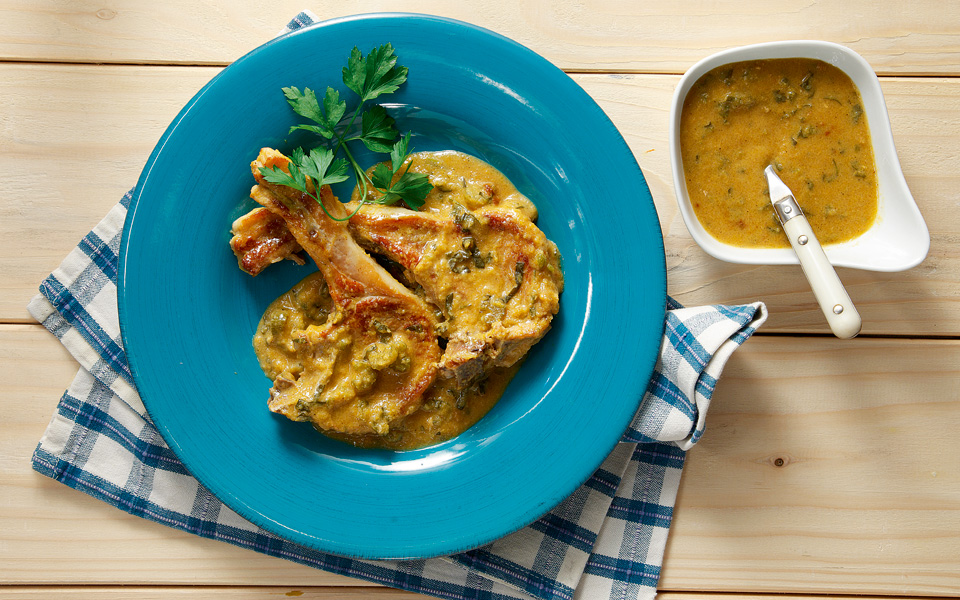 Μπριζόλες χοιρινές στο τηγάνι με σάλτσα λαχανικών