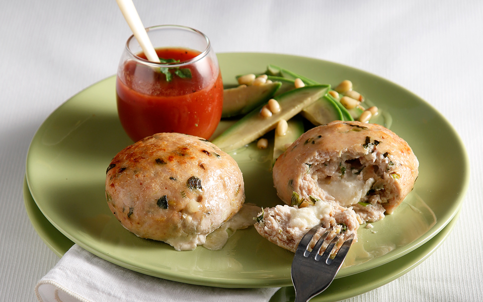 Σερβίρισμα: Μοιράζουμε τα μπιφτέκια στα πιάτα και δίπλα τους βάζουμε τις φέτες αβοκάντο. Σκορπίζουμε λίγο από το χυμό λεμονιού και το κουκουνάρι στο αβοκάντο, περιχύνουμε με λίγο λαδολέμονο ντομάτας τα μπιφτέκια και σερβίρουμε.