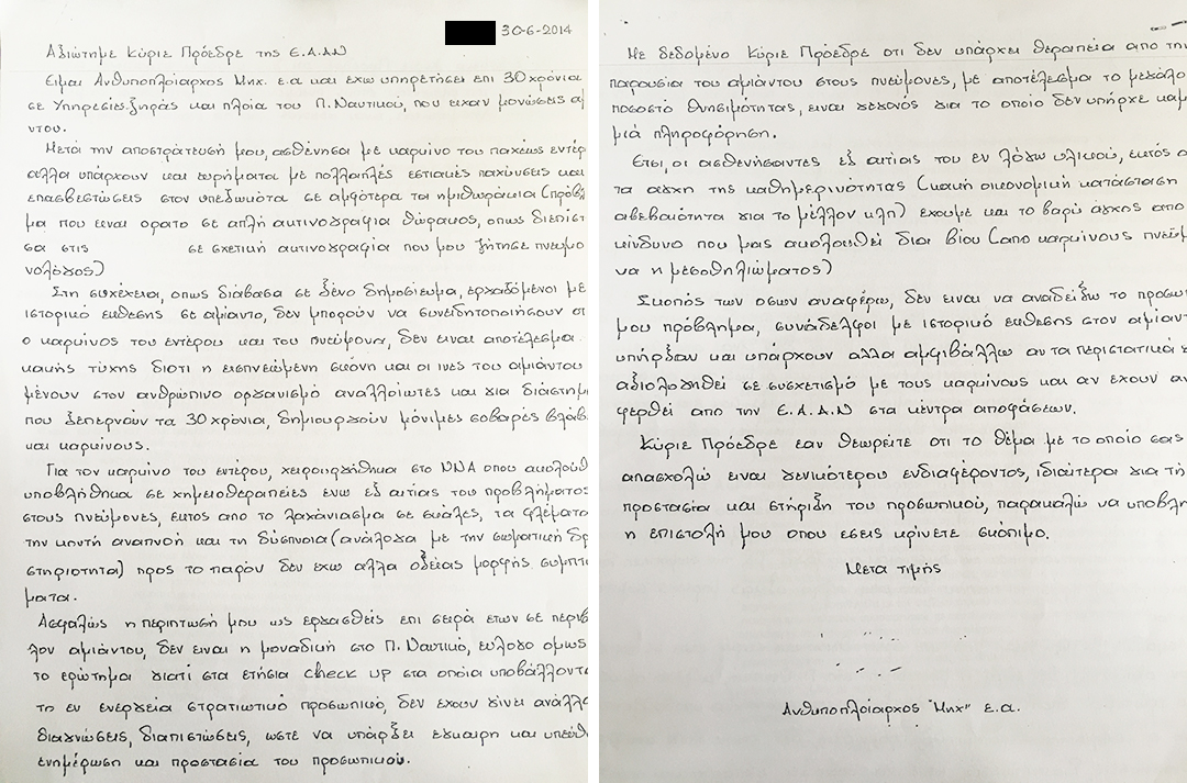 «Ασφαλώς η περίπτωσή μου ως εργασθείς επί σειρά ετών σε περιβάλλον αμιάντου, δεν είναι η μοναδική στο Πολεμικό Ναυτικό», γράφει στην επιστολή του. «Εύλογο, όμως, είναι το ερώτημα γιατί στα ετήσια check up στα οποία υποβάλλονταν το εν ενεργεία στρατιωτικό προσωπικό, δεν έχουν γίνει ανάλογες διαγνώσεις, διαπιστώσεις, ώστε να υπάρξει έγκαιρη και υπεύθυνη ενημέρωση και προστασία του προσωπικού».