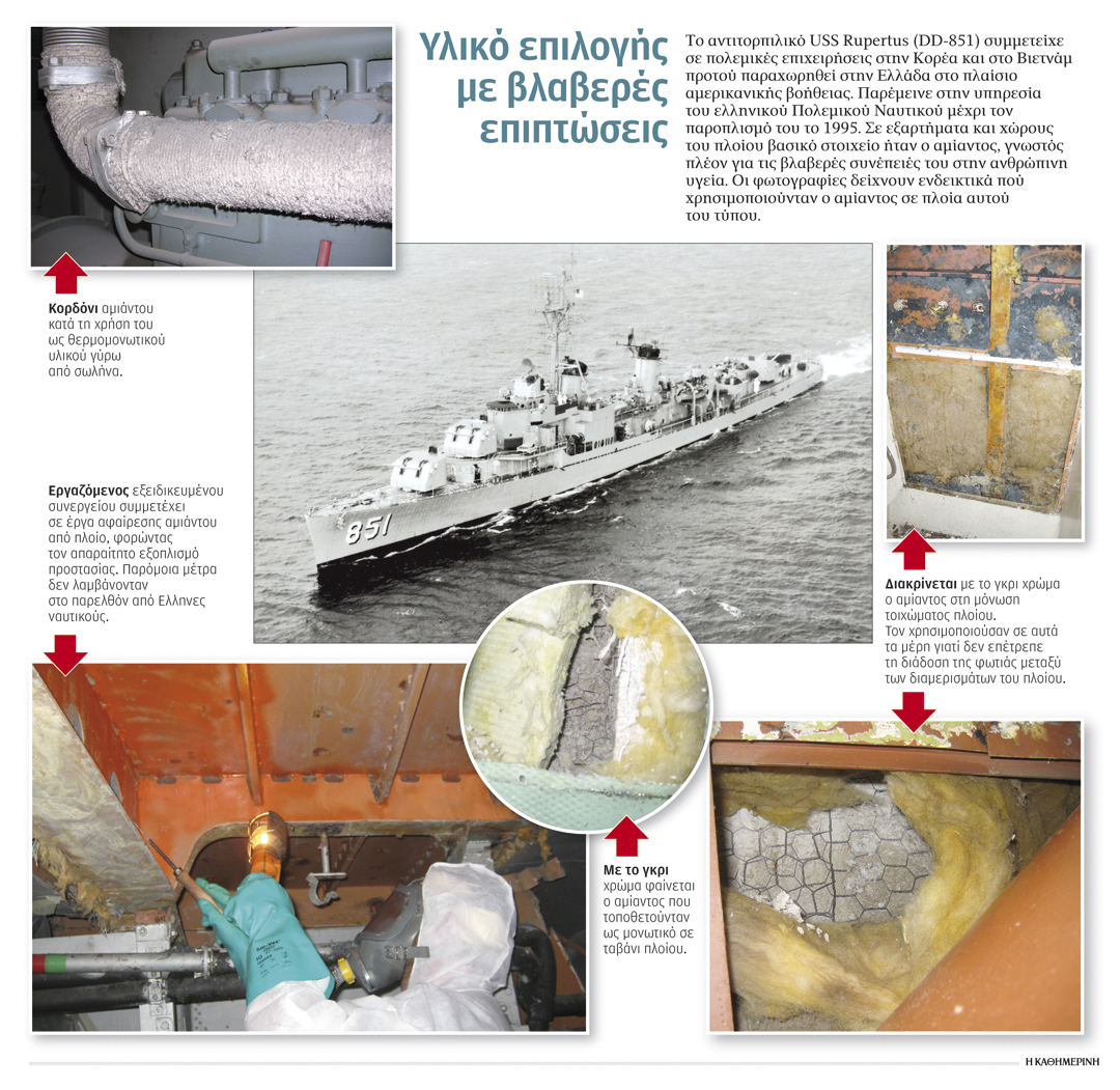 Μιλώντας με παθόντες και γιατρούς που τους εξέτασαν, αλλά και με δικηγόρους που τους εκπροσώπησαν σε Ελλάδα και ΗΠΑ η «Κ» παρουσιάζει άγνωστες πτυχές της περιπέτειας απόστρατων αξιωματικών του Πολεμικού Ναυτικού που υπηρέτησαν σε παλιά αντιτορπιλικά αμερικανικής κατασκευής. Κανείς δεν τους υποχρέωσε τότε να λάβουν μέτρα προστασίας και κανείς δεν τους είχε ενημερώσει επίσημα για τους κινδύνους στους οποίους μπορεί να εκτέθηκαν.