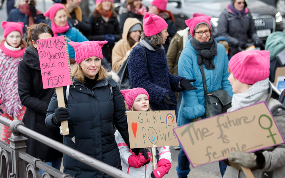 Με τουλάχιστον 600 προγραμματισμένες πορείες στις ΗΠΑ και κεντρική αυτή της Ουάσιγκτον, χιλιάδες γυναίκες φορώντας ροζ σκουφάκια, τα λεγόμενα "pussyhats" συρρέουν από το πρωί στο κέντρο της Ουάσινγκτον για να συμμετέχουν στην "Πορεία των Γυναικών".