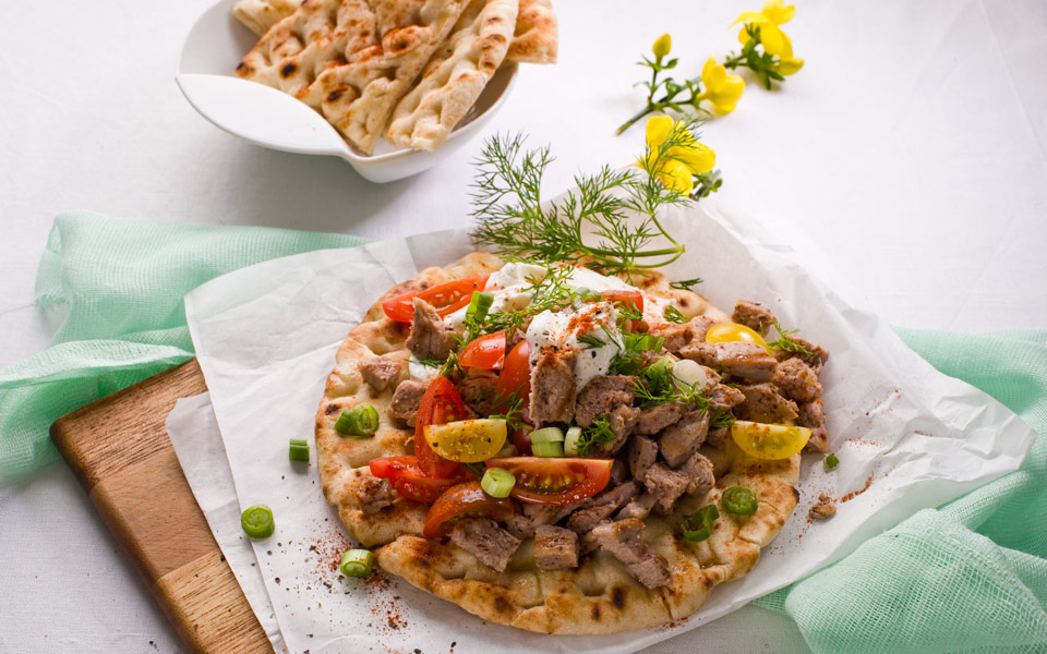 Απλώνουμε τις πίτες και μοιράζουμε τα κομματάκια κρέατος, το κρεμμύδι, τα ντοματίνια, το γιαούρτι, τον άνηθο, αλάτι, πιπέρι και πάπρικα. Τυλίγουμε τις πίτες με λαδόκολλα.