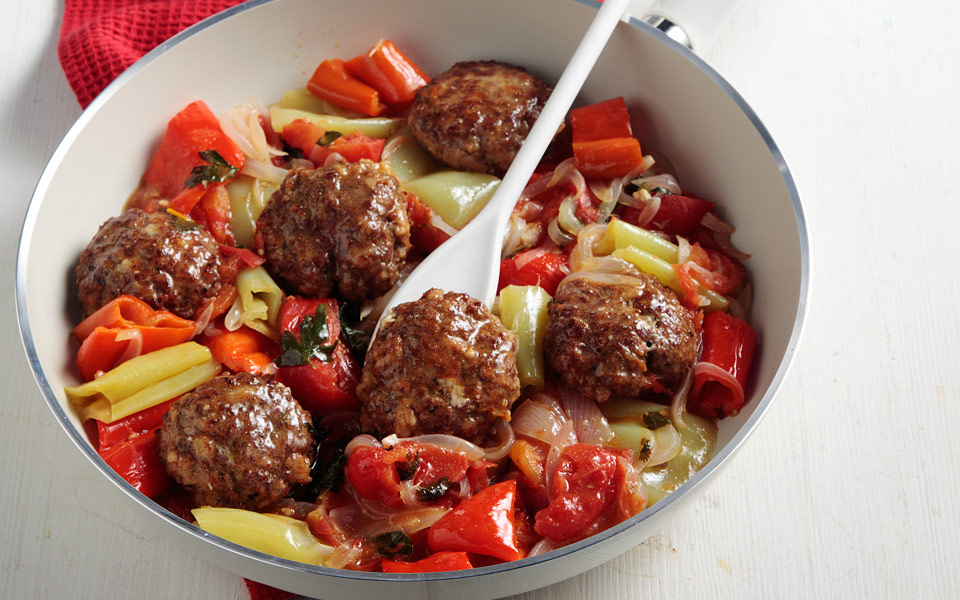 Λαχανικά: Σε ένα μεγάλο μπολ βάζουμε τις πιπεριές, τις ντομάτες, τα κρεμμύδια και το μαϊντανό, τα ανακατεύουμε ελαφρώς και στρώνουμε τη μισή ποσότητα σε μια φαρδιά κατσαρόλα. Από πάνω αραδιάζουμε τα μπιφτέκια, σε μονή στρώση, και τα καλύπτουμε με τα υπόλοιπα λαχανικά. Περιχύνουμε με το ελαιόλαδο και βάζουμε την κατσαρόλα σε μέτρια φωτιά. Καθώς ζεσταίνονται, τα λαχανικά αρχίζουν να βγάζουν υγρά που θα κοχλάσουν.