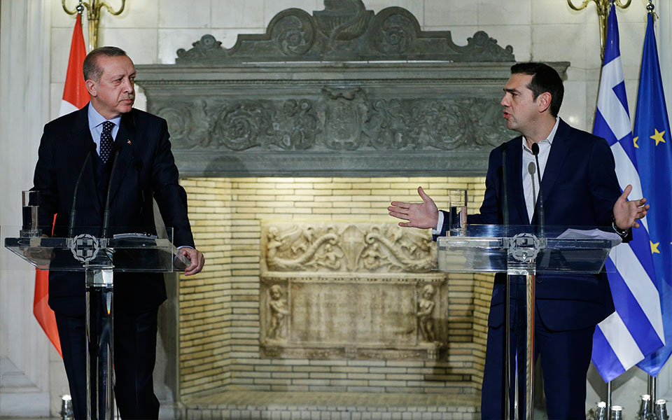 «Σε μια περίοδο κρίσης των ευρωτουρκικών σχέσεων και ανησυχητικών εξελίξεων στην Ανατολική Μεσόγειο με άμεσες συνέπειες στην σταθερότητα της περιοχής, στην ασφάλεια και το μεταναστευτικό η Ελλάδα πρότεινε στην Τουρκία να ανοίξει ένα νέο κεφάλαιο στις ελληνοτουρκικές σχέσεις, που «δεν θα βασίζεται στις προκλήσεις που είναι εύκολες αλλά στην επίπονη προσπάθεια να οικοδομούμε γέφυρες σε στέρεα θεμέλια», αναφέρουν κυβερνητικές πηγές, σχολιάζοντας τις επαφές Τσίπρα – Ερντογάν, κατά την σημερινή επίσκεψη του Τούρκου προέδρου στην Αθήνα. Προσθέτουν δε ότι «οπως τόνισε ο κ. Τσίπρας, αν η Τουρκία δεν το αποδεχτεί θα αποβεί τόσο εις βάρος της περιοχής όσο και των ευρωτουρκικών σχέσεων».