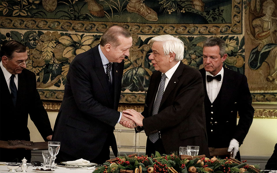 Σε πολύ χαμηλότερους τόνους, συγκριτικά με την πρώτη τους συνάντηση το μεσημέρι, όπου οι αναφορές στη Συνθήκη της Λωζάννης πυροδότησαν τεταμένο κλίμα, κινήθηκαν οι κ.κ. Παυλόπουλος και Ερντογάν, στις τοποθετήσεις τους πριν από το επίσημο δείπνο προς τιμήν του Τούρκου Προέδρου.