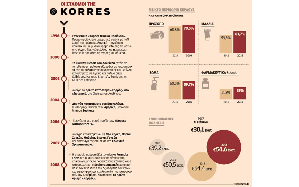 Η προσοχή του είναι προσηλωμένη αφενός στην έρευνα και ανάπτυξη νέων καινοτόμων προϊόντων βασισμένων σε φυσικά συστατικά, με συσκευασίες πρωτοποριακού σχεδιασμού και αισθητικής, και αφετέρου στη διαρκή επέκταση στο εξωτερικό. Είναι άλλωστε αυτή η τακτική που έχει επιτρέψει στην «Κορρές» Α.Ε. μέσα στα χρόνια της κρίσης να μειώσει τον δανεισμό της, να αυξήσει τις ταμειακές της ροές, να βελτιώσει τα περιθώρια κέρδους της, να εξορθολογήσει τον ισολογισμό της και να προσελκύσει ταλέντο. Με αυτό τον τρόπο οι εξαγωγές αυξήθηκαν από 15%-20% πριν από λίγα χρόνια σε άνω του 45% σήμερα, με παράλληλη αύξηση του κύκλου εργασιών. Ο κύκλος εργασιών έχει έτσι αυξηθεί από τα 39 εκατομμύρια στη χρήση του 2013 στα 54,5 εκατομμύρια το 2016. Και ήδη το πρώτο εξάμηνο φέτος ξεπέρασε τα 30 εκατομμύρια. Ο δε δανεισμός βρίσκεται στα επίπεδα των 34,8 εκατ., αλλά μετά την αφαίρεση των ταμειακών διαθεσίμων, ο καθαρός δανεισμός είναι 24,4 εκατ.
