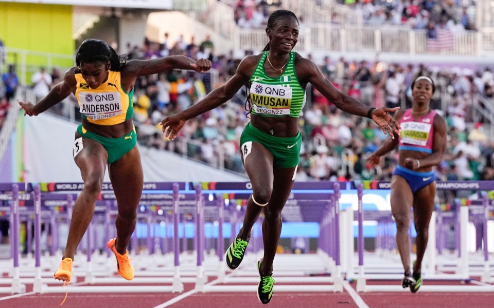 Η Τόμπι Αμουζάν κατέκτησε το χρυσό μετάλλιο στα 100 μέτρα με εμπόδια στο Παγκόσμιο Πρωτάθλημα στίβου στο Όρεγκον. Η σπρίντερ από τη Νιγηρία τερμάτισε σε 12.06 δευτερόλεπτα, που ήταν νέο παγκόσμιο ρεκόρ.