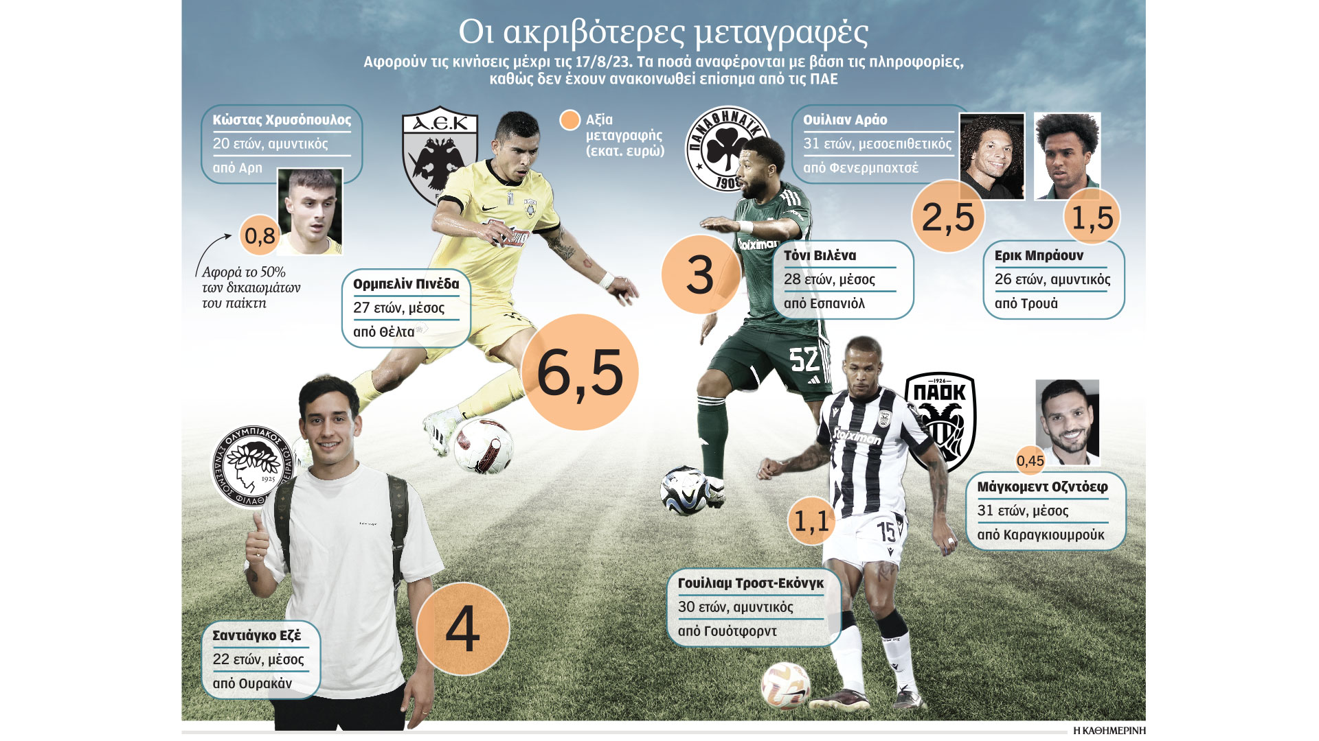 Στον Ολυμπιακό, τα πάντα χτίζονται από την αρχή. Εκτός από νέο προπονητή (Ντιέγκο Μαρτίνεθ), έχουν γίνει εννέα μεταγραφές (δεν υπολογίζονται οι δανεικοί που επέστρεψαν). Από αυτές ο Εζέ αναμένεται να στοιχίσει περίπου 4 εκατ. ευρώ, ενώ οι υπόλοιποι (Ιμπόρα, Κίνι, Αλεξανδρόπουλος, Φρέιρε, Πορόζο, Ελ Κααμπί, Σκάρπα, Μπρνιτς) αποκτήθηκαν είτε ως ελεύθεροι είτε ως δανεικοί. Οσον αφορά στον ΠΑΟΚ, χρήματα δόθηκαν για τους Γουίλιαμ Τροστ-Εκόνγκ (1,1 εκατ.) και Οζντόεφ (450.000), ενώ Κεντζιόρα, Σαμάτα και Μπαμπά πήγαν στην Τούμπα ως ελεύθεροι.