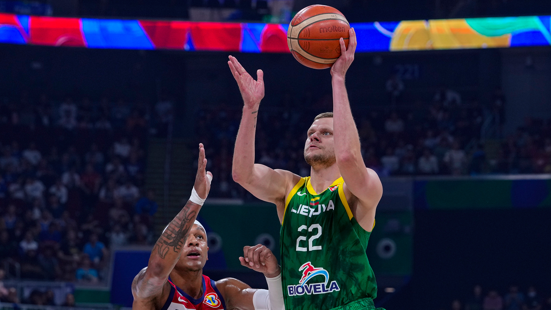 Με «βροχή» από τρίποντα, και συγκεκριμένα 14/25, η «Λιέτουβα» επιβλήθηκε στις ΗΠΑ. Η Λιθουανία δεν είχε έναν σκόρερ που ξεχώρισε, αλλά πολλούς στην επίθεση, με επτά παίκτες του Μακσβίτις να σημειώνουν διψήφιο νούμερο πόντων. Ο Καρινιάουσκας σημείωσε 15 πόντους, ο Κουζμίνσκας 14, ο Βαλαντσιούνας 12 (και 7 ριμπάουντ), από 11 πόντους πέτυχαν οι Μπραζντέικις, Ντίμσα και Σεντεκέρσκις, ενώ 10 πρόσθεσε ο Μπέντζιους.
