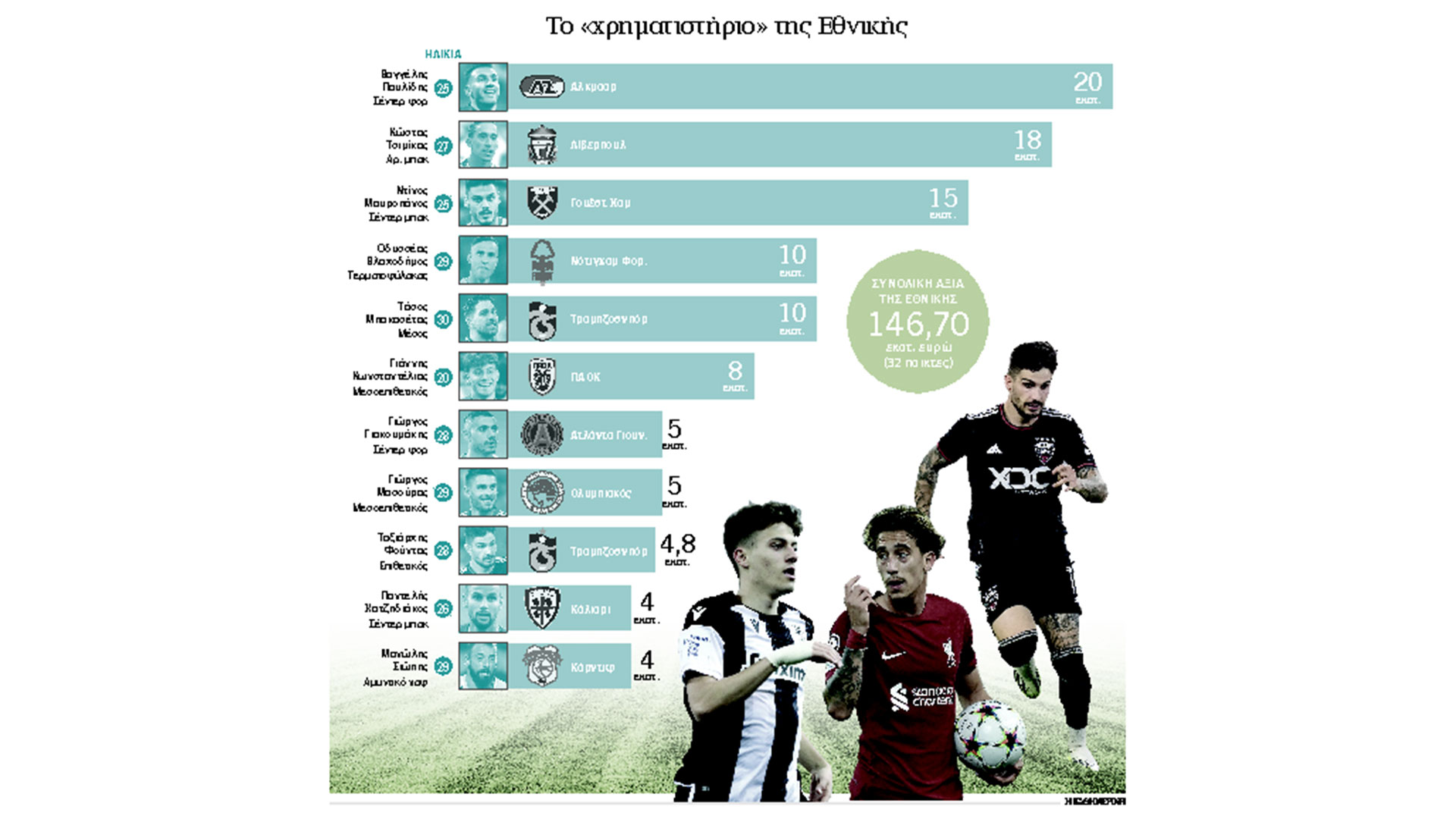 Από τους 32 διεθνείς που ήταν στη διάθεση του Πογιέτ στην προκριματική φάση, μόλις οι 13 αγωνίζονται στην ελληνική λίγκα, με την Εθνική να αποτιμάται στα 146,70 εκατ. ευρώ.