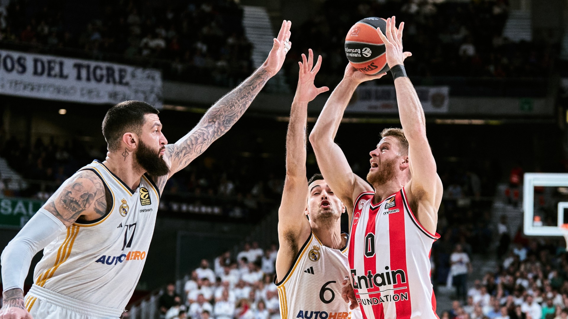 Η Ρεάλ Μαδρίτης νίκησε τον Ολυμπιακό (90-85) των σημαντικών απουσιών, αλλά οι παίκτες του Γιώργου Μπαρτζώκα άγγιξαν το «διπλό» χάρη κυρίως στον Κώστα Παπανικολάου (25π. με 6/8τρ.). Τραυματίστηκε ο Λαρεντζάκης. Στο 12-11 το ρεκόρ των Πειραιωτών.