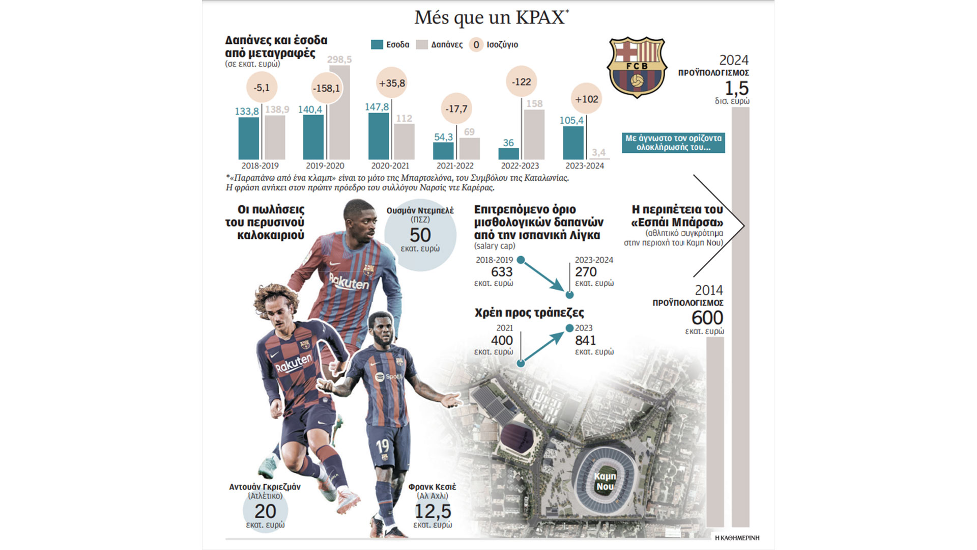 Είναι χαρακτηριστικό πως το 2021 τα χρέη της Μπαρτσελόνα στις τράπεζες ανέρχονταν σε περίπου 400 εκατ. ευρώ, αλλά το 2023 ανήλθαν σε 841 εκατ. ευρώ. Ο τίτλος του πρωταθλήματος πέρυσι ήρθε με τεράστιο οικονομικό άνοιγμα. Οπως μάλιστα επισημαίνουν στη Βαρκελώνη, ενώ άλλες μεγάλες ομάδες της Ευρώπης έχουν έξοδα 800 εκατ. ευρώ τον χρόνο, όπως η Ρεάλ και η Μάντσεστερ Σίτι, η Μπάρτσα έχει έξοδα 1,16 δισ. ευρώ. Υπολογίζεται ότι ο καταλανικός σύλλογος χρωστάει ακόμη περί τα 200 εκατ. ευρώ για μεταγραφές που έχει ήδη κάνει και δεν έχει ακόμη αποπληρώσει.