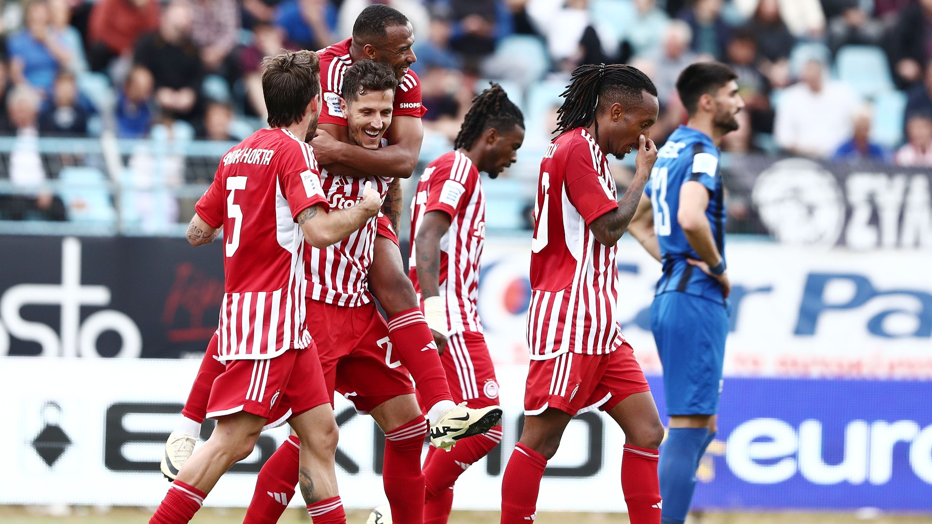 Στο 22′ ο Γιόβετιτς με υπέροχο τελείωμα πέτυχε το 1-0. Ο Μαυροβούνιος άσος ήταν πρωταγωνιστής και στη φάση του 0-2, καθώς τρία λεπτά αργότερα κέρδισε το πέναλτι από τον Τσιλούλη κι έδωσε την ευκαιρία στον Ελ Κααμπί να διπλασιάσει από την άσπρη βούλα για τον Ολυμπιακό, στο 26΄. Στο 45’+1΄ ο Γιόβετιτς μοίρασε και ο Παπαδόπουλος με αυτογκόλ σημείωσε το 3-0. Το 4-0 ήρθε με αυτογκόλ του Κορνέζου, ενώ ο Ελ Αραμπί πέτυχε το 94ο τέρμα του με τα «ερυθρόλευκα» γράφοντας το 0-5. Ο Λέικ στο 88΄ διαμόρφωσε το 5-1.
