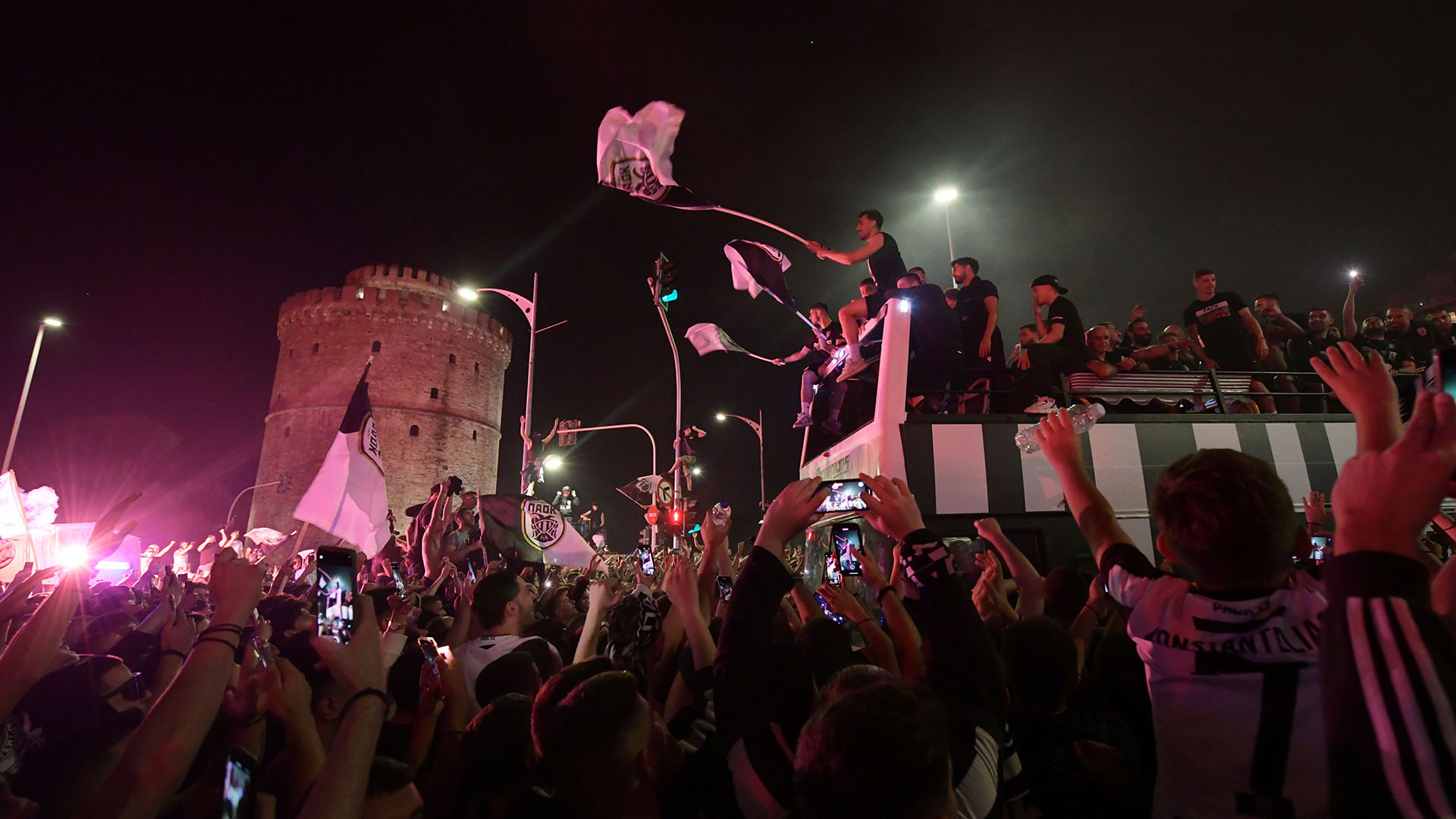 Λίγο μετά τις 2 τα ξημερώματα το ανοιχτό λεωφορείο στο οποίο επέβαιναν οι παίκτες του «Δικεφάλου» έστριψε από την οδό Τσιμισκή για να κατηφορίσει προς τον Λευκό Πύργο. Μπροστά του απλωνόταν μια λαοθάλασσα φιλάθλων του ΠΑΟΚ που πανηγύριζαν για την κατάκτηση του τίτλου.