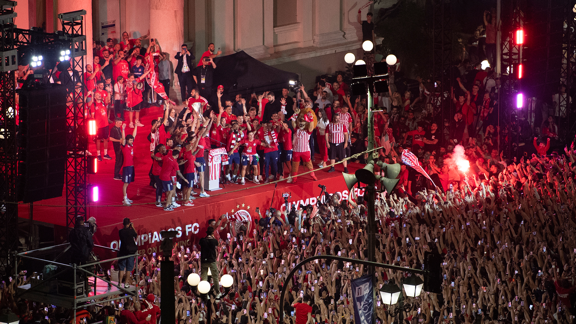Τους παίκτες και την τεχνική ηγεσία του Ολυμπιακού, μαζί με τον πρόεδρο Βαγγέλη Μαρινάκη, περίμενε στο Δημοτικό Θέατρο ο δήμαρχος Πειραιά και λίγο αργότερα, μπροστά από τον ειδικά διαμορφωμένο χώρο στην πλατεία Κοραή, ο κ. Μαρινάκης αλλά και ο αρχηγός Κώστας Φορτούνης μίλησαν μπροστά στους χιλιάδες φιλάθλους της ομάδας μέσα σε ντελίριο ενθουσιασμού με πυροτεχνήματα και καπνογόνα.