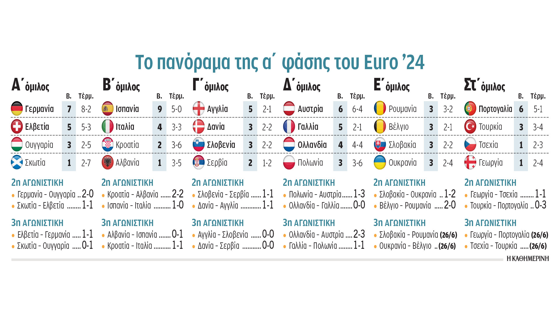 Από κει και πέρα, θέση στην επόμενη φάση έχουν κλείσει οι Γερμανία, Ελβετία, Ισπανία και Ιταλία, με την τελευταία να το πετυχαίνει μέσα από έναν αγώνα που θα μείνει σίγουρα αξέχαστος. Στο τελευταίο ματς για τον 2ο όμιλο με την Κροατία οι Ιταλοί βολεύονταν με την ισοπαλία, αλλά ο Μόντριτς στο 55΄ πέτυχε το γκολ που χάρισε την πρόκριση στην ομάδα του και ενώ ένα λεπτό νωρίτερα το πέναλτι που είχε εκτελέσει το απέκρουσε ο Ντοναρούμα. Ομως στο 8ο λεπτό των καθυστερήσεων ο Ματία Ζακάνι με ένα εξαιρετικό πλασέ έκανε το 1-1 και η πρόκριση άλλαξε χέρια…