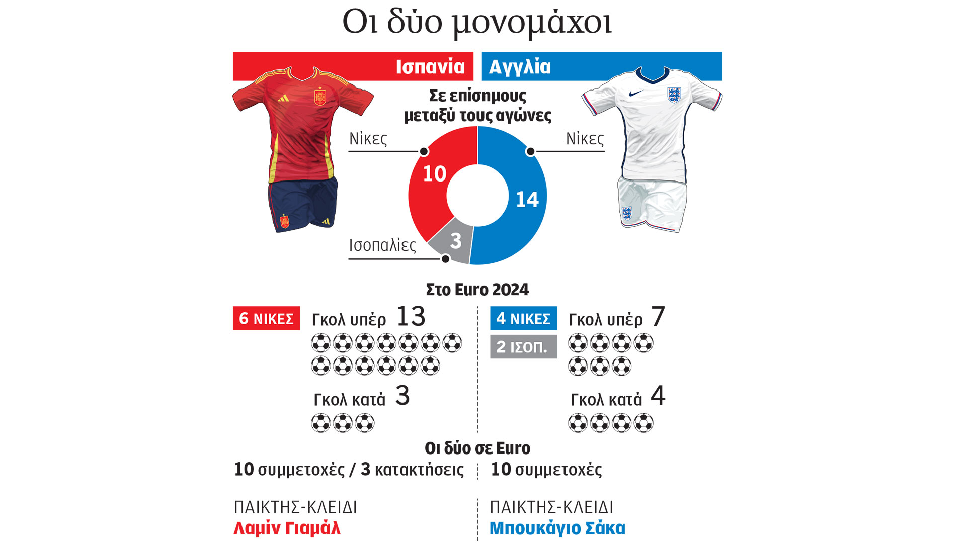 Η Ισπανία έπαιξε μακράν το καλύτερο ποδόσφαιρο και πείθει ότι παρά τη ριζική ανανέωση που έκανε, έχει το μέταλλο για να τα καταφέρει. Η Αγγλία έχει πολύ περισσότερα να δώσει και ακριβώς επειδή το θέλει πάρα πολύ, διόλου απίθανο να μη σπαταλήσει και αυτή την ευκαιρία. Οπως και να ‘χει, θα είναι ένας λαμπερός τελικός ανάμεσα σε δύο μεγάλες ποδοσφαιρικές σχολές που χρόνια τώρα διαθέτουν τα πιο ανταγωνιστικά πρωταθλήματα στην Ευρώπη!