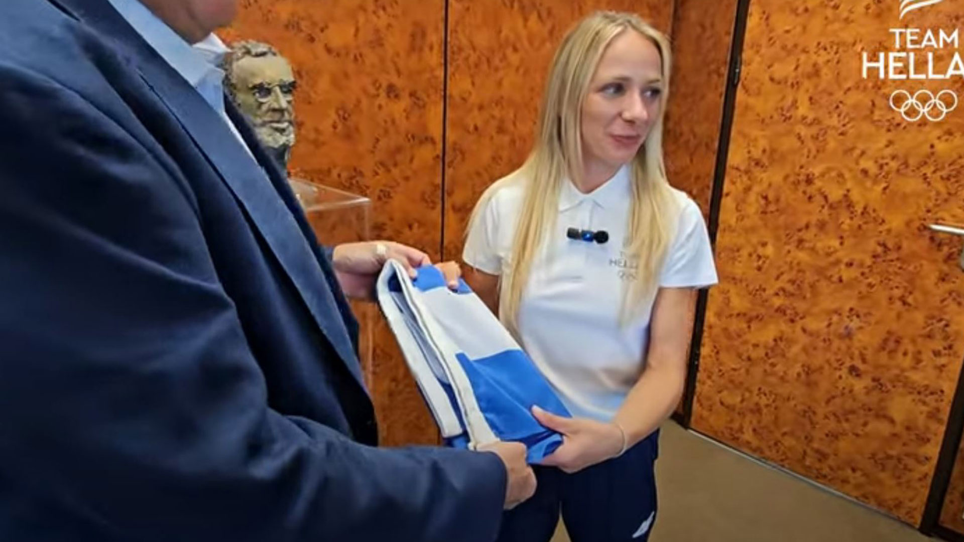 Ο κ. Καπράλος υποδέχθηκε την παγκόσμια πρωταθλήτρια του βάδην στο γραφείο του στην ΕΟΕ και της παρέδωσε συμβολικά τη Σημαία λίγες ώρες πριν αναχωρήσει για το Παρίσι για να συμμετάσχει στη Γενική Συνέλευση της Διεθνούς Ολυμπιακής Επιτροπής.
