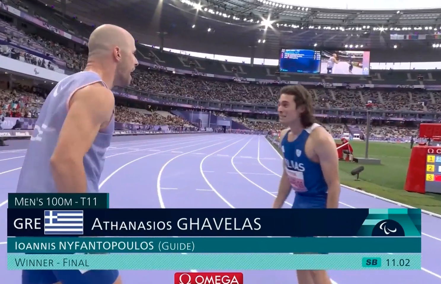 Το χρυσό μετάλλιο στα 100 μέτρα Τ11 κέρδισε ο Νάσος Γκαβέλας, έχοντας για οδηγό τον Ιωάννη Νυφαντόπουλο.