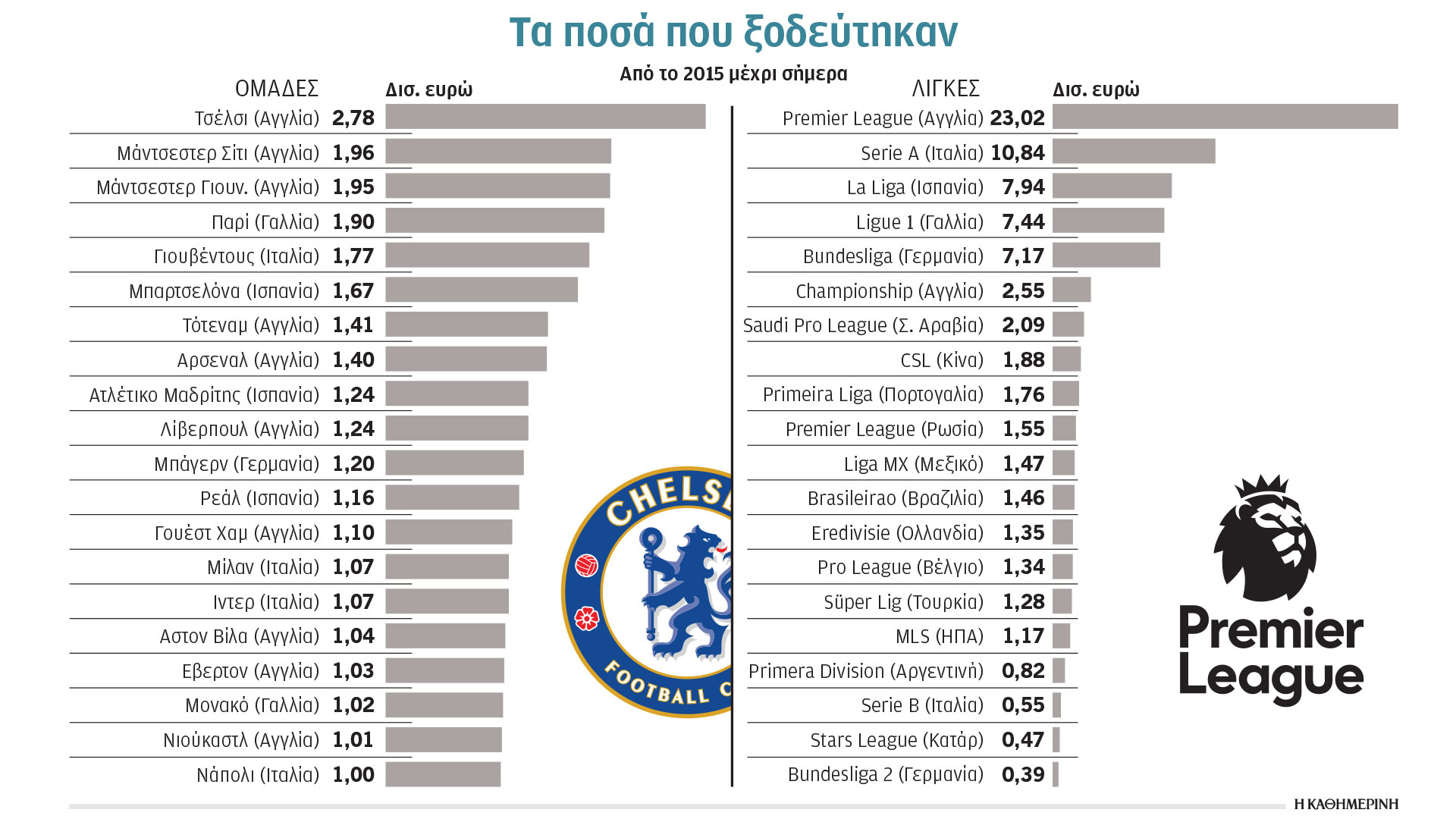 Η συνέπεια της τακτικής αυτής ήταν η Τσέλσι να έχει ξοδέψει από το 2015 έως και το 2024 για μεταγραφές (περιλαμβανομένων και των μπόνους που προβλέπονταν – ασχέτως εάν έχουν καταβληθεί έως τώρα ή όχι) περί τα 2,78 δισ. ευρώ. Πρόκειται για ποσό που σήμερα αντιστοιχεί περίπου στο 1,4% του ετήσιου ακαθάριστου προϊόντος ολόκληρης της Ελλάδας. Είναι επίσης ούτε λίγο ούτε πολύ 42% μεγαλύτερο από τα αντίστοιχα ποσά που δαπάνησαν η δεύτερη και η τρίτη στην κατάταξη των μεταγραφικών δαπανών την ίδια περίοδο, δηλαδή η Μάντσεστερ Σίτι (με σαφώς καλύτερα αποτελέσματα από την Τσέλσι) και η Μάντσεστερ Γιουνάιτεντ. Εκπληξη δεν αποτελεί ότι την πρώτη πεντάδα συμπληρώνουν οι Παρί Σεν Ζερμέν και Γιουβέντους, μπροστά από Μπαρτσελόνα, Τότεναμ, Αρσεναλ, Ατλέτικο Μαδρίτης και Λίβερπουλ, αλλά ότι εκτός δεκάδας βρίσκεται η μακράν πιο επιτυχημένη ομάδα και της τελευταίας δεκαετίας, η Ρεάλ Μαδρίτης, με 1,16 δισ. σε 10 χρόνια, πίσω και από την Μπάγερν Μονάχου. Αλλωστε η Ρεάλ –όπως έκανε και στην περίπτωση του Κιλιάν Εμπαπέ– δεν διστάζει να περιμένει την κατάλληλη στιγμή ώστε να πληρώσει τα λιγότερα δυνατά χρήματα για τους καλύτερους δυνατούς ποδοσφαιριστές.