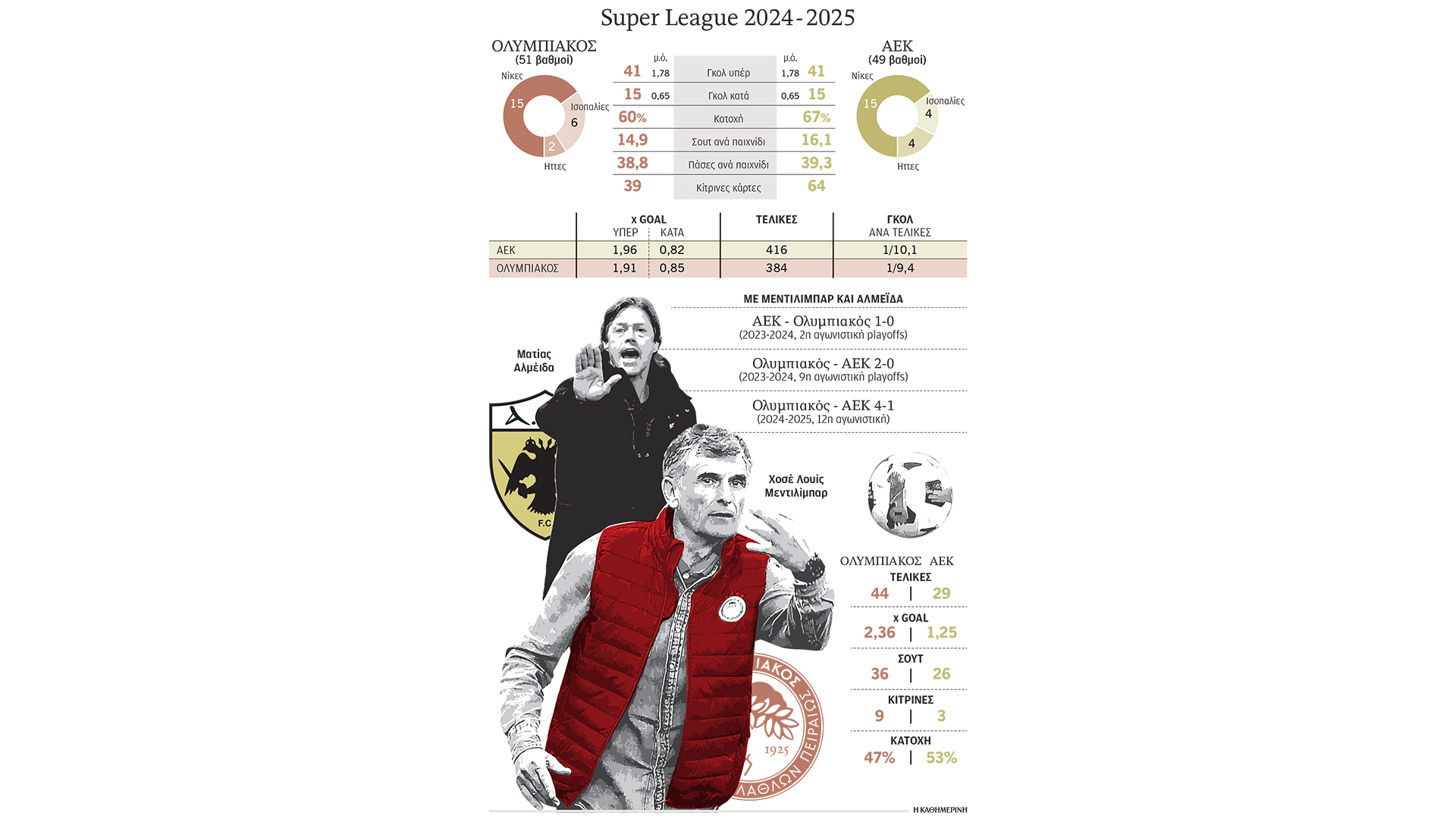 Ως ειδικός, ο κ. Πετράκης κάνει μια ακτινογραφία των δύο αντιπάλων: «Αν και οι αριθμοί δεν λένε πάντα όλη την αλήθεια στο ποδόσφαιρο, η στατιστική επιβεβαιώνει ότι πρόκειται για δύο ομάδες σχεδόν ισοδύναμες, ισορροπημένες και με πολλά κοινά στοιχεία στο παιχνίδι τους, όπως η επιθυμία για κυριαρχία, η καλή κυκλοφορία της μπάλας, η πίεση ψηλά για την ανάκτηση της κατοχής και την εκδήλωση νέας επίθεσης. Σε γενικές γραμμές, έχουν κοινές αρχές, με κάποιες διαφορές, βέβαια, όπως η επιλογή της ΑΕΚ να αμύνεται περισσότερο με προσωπικά μαρκαρίσματα και του Ολυμπιακού να αμύνεται στον χώρο. Τα ντέρμπι δεν είναι συνηθισμένα παιχνίδια, γι’ αυτό και βλέπουμε συχνά μια διαφοροποίηση της στατιστικής εικόνας σε σχέση με τα υπόλοιπα. Καθορίζονται συχνά από στιγμές, μονομαχίες, προσωπικές ενέργειες, λάθη, τύχη, πολλούς παράγοντες. Παρότι είμαι θιασώτης της ομαδικής δουλειάς, σίγουρα η ατομική ποιότητα μπορεί να κρίνει ένα τέτοιο παιχνίδι. Τόσο η ΑΕΚ όσο και ο Ολυμπιακός έχουν παίκτες για να το κάνουν αυτό. Ο Λιβάι Γκαρσία ήταν πολύ σημαντικός και το κενό του δεν θα καλυφθεί εύκολα. Η χρησιμοποίηση του Λαμέλα σε αυτό τον ρόλο έγινε αναγκαστικά και εκτιμώ ότι δεν θα είναι μόνιμη επιλογή του Αλμέιδα σε ντέρμπι. Οι προπονητές είναι σίγουρα καθοριστικοί, αλλά μην ξεχνάτε ότι στη δουλειά μας επιλέγουμε με την πιθανότητα και όχι τη σιγουριά. Παίρνουμε μια απόφαση και κάνουμε τον σταυρό μας να βγει. Δεν θεωρώ καθοριστικό το παιχνίδι τους για το πρωτάθλημα. Υπάρχουν εννέα αγωνιστικές ακόμη, οι διαφορές είναι μικρές και όλα μπορεί να συμβούν».