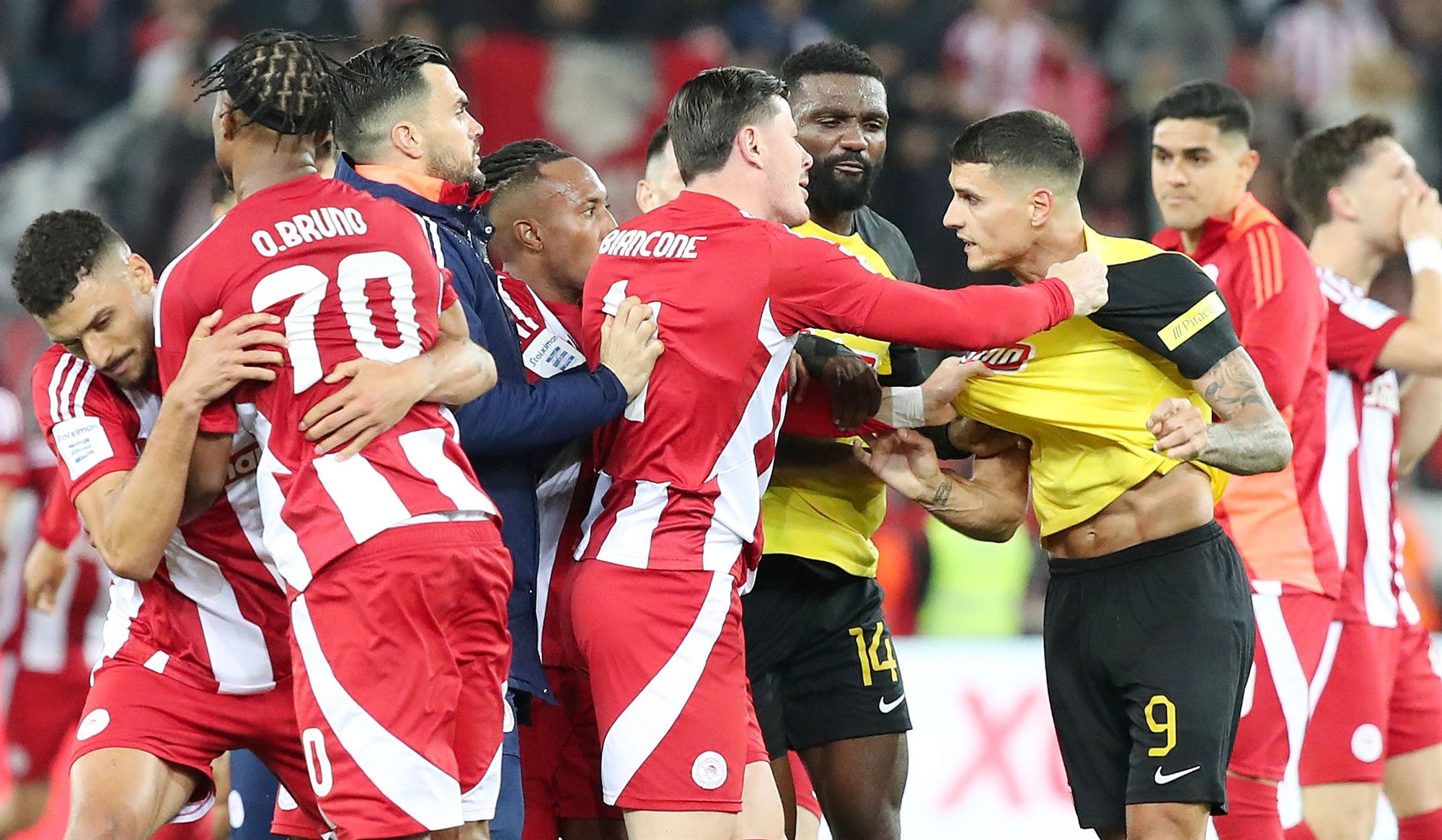 Πάντως, το ντέρμπι σημαδεύτηκε μετά τη λήξη του από μεγάλης έντασης επεισόδια μεταξύ των παικτών των δύο ομάδων, με τη σπίθα να ανάβει έπειτα από διαπληκτισμό που είχαν ο Λαμέλα με τον Μπρούνο, ενώ στη συνέχεια η σύρραξη γενικεύτηκε και μέσα σε ελάχιστα λεπτά ο αγωνιστικός χώρος στο «Γ. Καραϊσκάκης» μετατράπηκε σε ρινγκ. Τα όσα συνέβησαν έφεραν τις αποβολές των Πασχαλάκη, Κάρμο, Μαρσιάλ, Μουκουντί αλλά και του Ματίας Αλμέιδα.