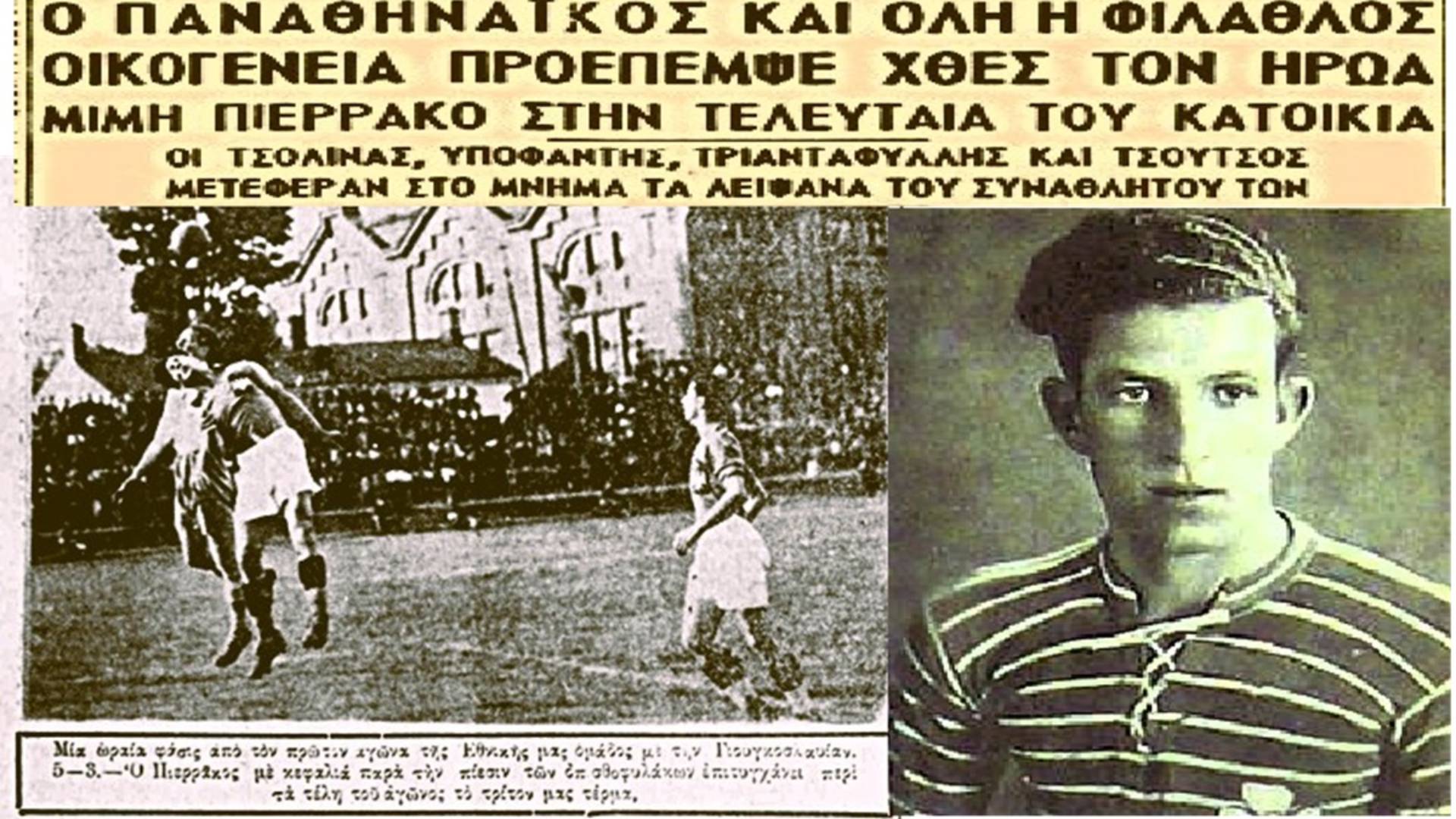 Ένας από τους σταρ του ελληνικού ποδοσφαίρου της εποχής εκείνης ήταν ο Μίμης Πιερράκος του Παναθηναϊκού. Γεννημένος το 1909 στο Γύθειο αλλά κάτοικος Αθήνας από το 1912 μαζί με την υπόλοιπη οικογένειά του, αποτέλεσε βασικό στέλεχος του Παναθηναϊκού τη δεκαετία του ’30, ενώ αγωνίστηκε για τρία χρόνια στην Κύπρο και την Ανόρθωση. Ο Πιερράκος είχε το παρατσούκλι «Μπρακ» και υπήρξε μέλος της Εθνικής Ελλάδας από τα πρώτα χρόνια της σύστασής της.