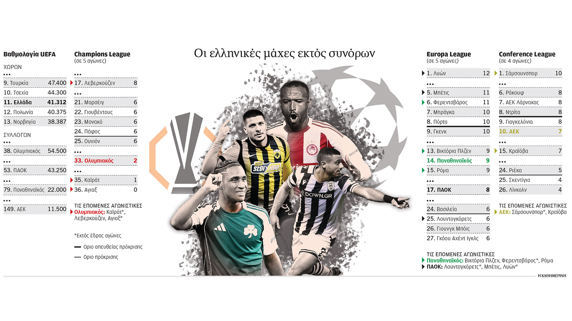 Με τα τωρινά δεδομένα, καλές πιθανότητες για να συνεχίσουν είτε απευθείας στη φάση των «16» είτε στα πλέι οφ, έχουν οι τρεις από τις τέσσερις ομάδες μας, δηλαδή ο Παναθηναϊκός με τον ΠΑΟΚ στο Europa League και η ΑΕΚ στο Conference.