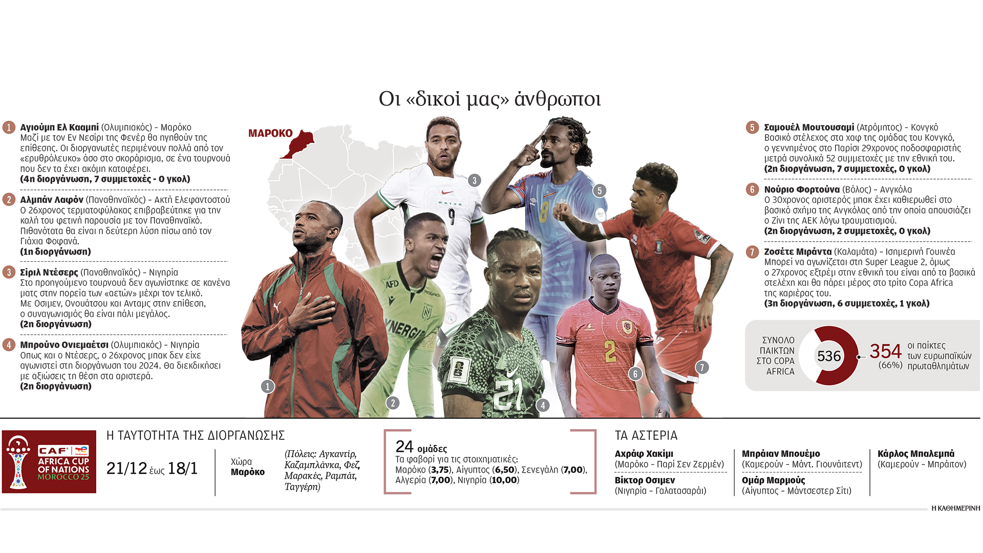 Η αλήθεια είναι ότι η διοργάνωση του φετινού Κυπέλλου Εθνών μέσα στις γιορτές, όταν πολλά εθνικά πρωταθλήματα διακόπτονται, περιορίζει κάπως την απώλεια για τους ευρωπαϊκούς συλλόγους, στους οποίους αγωνίζονται περίπου δύο στους τρεις από τους παίκτες που θα βρεθούν για το τουρνουά στο Μαρόκο.