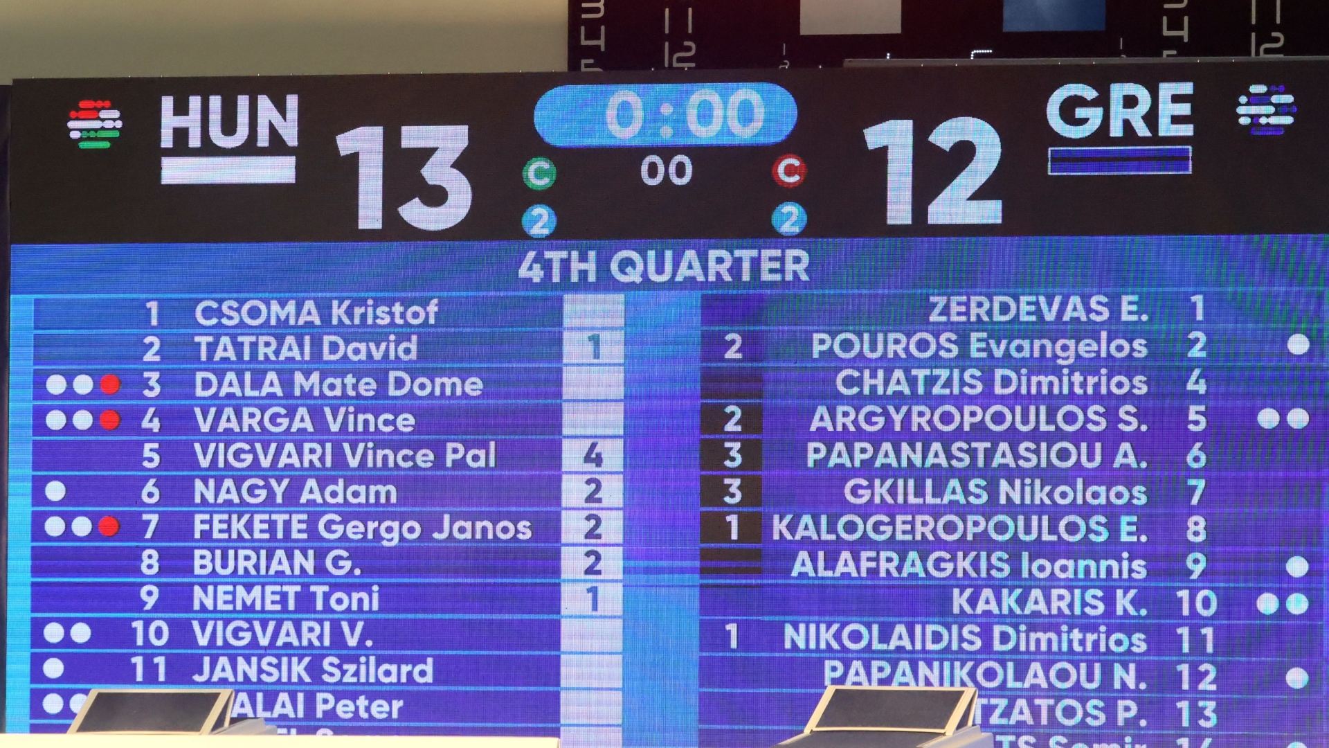 Με πέναλτι, που κέρδισαν μετά από challenge του προπονητή τους, οι Ούγγροι πήραν προβάδισμα με τον Βέντελ Βίγκβαρι, με τον Γκίλλα να απαντά άμεσα από την περιφέρεια. Στα δύο λεπτά πριν από τη λήξη, με την ελληνική ομάδα να παίζει με παίκτη παραπάνω, ο Παπαναστασίου «σημάδεψε» το δοκάρι και κατευθείαν δέχθηκε κόντρα από τον Ανταμ Νάγκι, που «έγραψε» το 12-11. Οι διεθνείς κέρδισαν ακόμη μία αποβολή και, μετά το τάιμ-άουτ του Βλάχου, ο Αργυρόπουλος ισοφάρισε στα 1΄18΄΄ πριν από το τέλος, αλλά στην τελευταία επίθεση της Ουγγαρίας ο Κάκαρης χρεώθηκε με ποινή και ο Μπούριαν στην εκπνοή του χρόνου επίθεσης έδωσε τη νίκη στην ομάδα του.