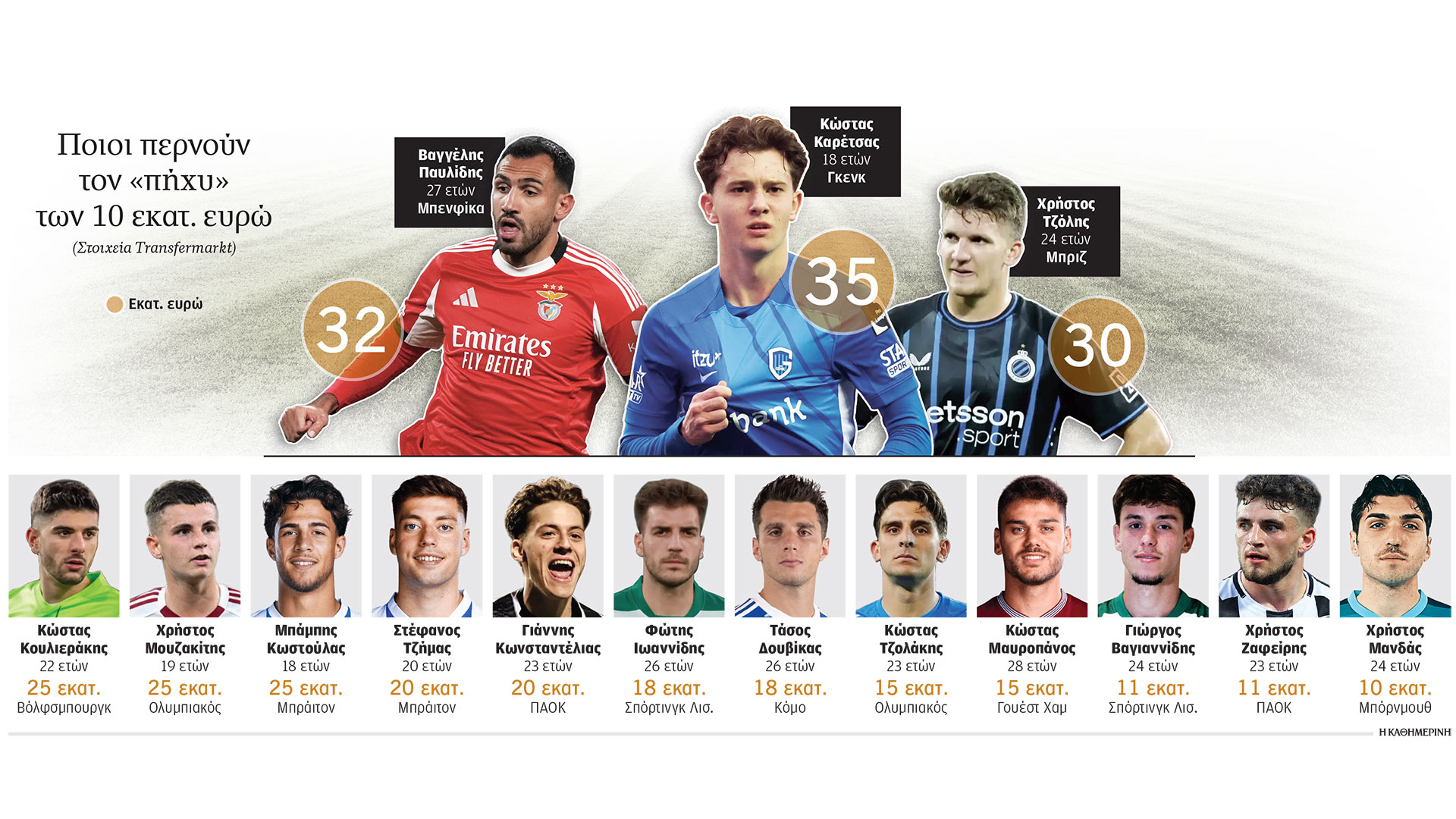 Και για αυτούς, ευρωπαϊκοί κολοσσοί δείχνουν το ενδιαφέρον τους: ομάδες από την Premier League για τον Χρήστο Τζόλη, Παρί Σεν Ζερμέν και Γιουβέντους για τον Χρήστο Μουζακίτη και η μισή Μπουντεσλίγκα για τον Γιάννη Κωνσταντέλια, ο οποίος φαντάζει… πολυτέλεια για το ελληνικό πρωτάθλημα.