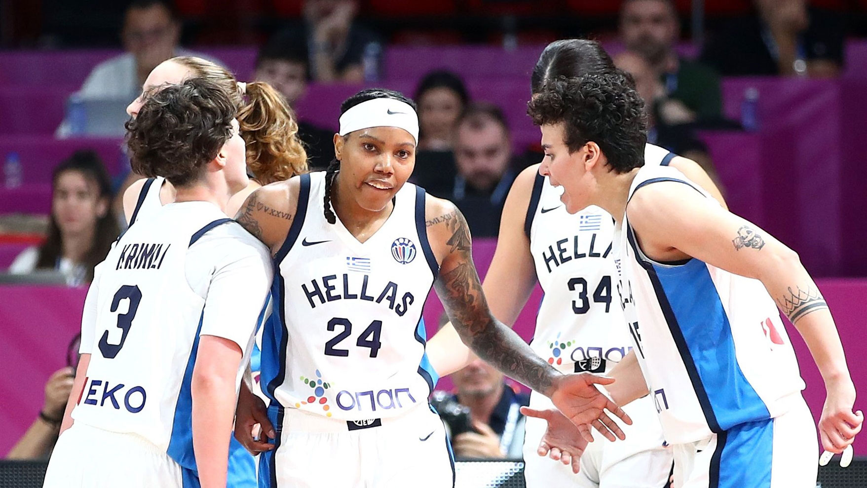 ΕΛΛΑΔΑ (21/44 δίπ., 7/21 τρ., 24/29 β., 43 ρ. –30 αμυντικά – 13 επιθετικά–, 27 ασ., 13 κλ., 1 μπλοκ, 13 λ., 13 φάουλ): Κριμίλη 8 (1 τρ., 6 ασ.), Μποσγανά 14 (1/3 δίπ., 3/6 τρ., 3/4 β., 5 ρ., 2 ασ.), Παυλοπούλου 5 (1 τρ., 5 ασ.), Νικολοπούλου 1, Λούκα 2 (4 ρ.), Σπανού 6 (5 ρ., 6 ασ., 4 κλ.), Χατζηλεοντή 4 (4 ρ.), Χριστινάκη 12 (3/4 δ., 1/1 τρ., 3/4 β.), Παρκς 14 (4/9 δίπ., 1/2 τρ., 3/3 β., 6 ρ., 3 ασ.), Χαιριστανίδου, Φασούλα 21 (7/12 δίπ., 7/8 β., 6 ρ., 4 ασ.), Καρλάφτη.
