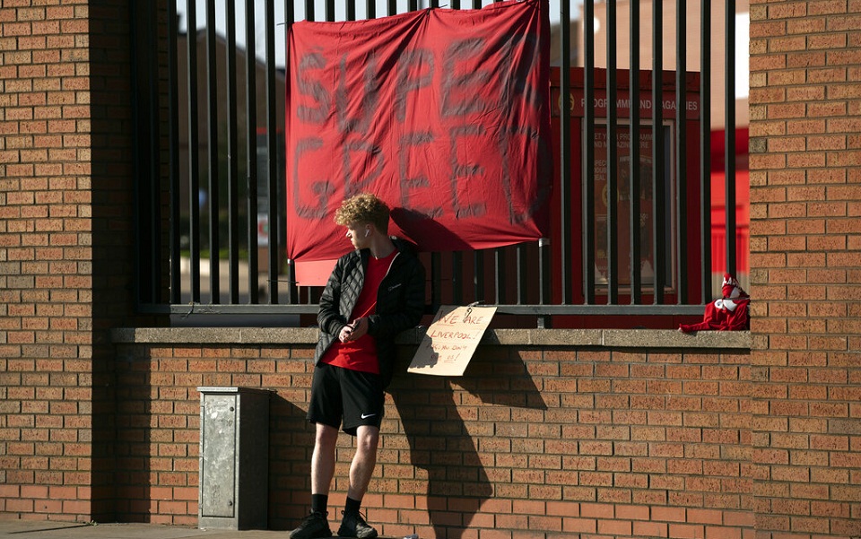 Έτσι από την πρώτη μέρα της ανακοίνωσης του σχεδίου των 12 αγγλικών, ισπανικών και ιταλικών συλλόγων οι οπαδοί στην Αγγλία έσπευσαν στις έδρες των ομάδων τους να εκφράσουν πιο παραστατικά την αντίθεσή τους, όπως ο παραπάνω φίλος της Λίβερπουλ που βρίσκεται έξω απο το Άνφιλντ και φωτογραφίζεται κάτω από ένα πανό που αναφέρει τις λέξεις «Σούπερ Λαιμαργία», αλλά και δίπλα σε πλακάτ με τις λέξεις: «Εμείς είμαστε η Λίβερπουλ».