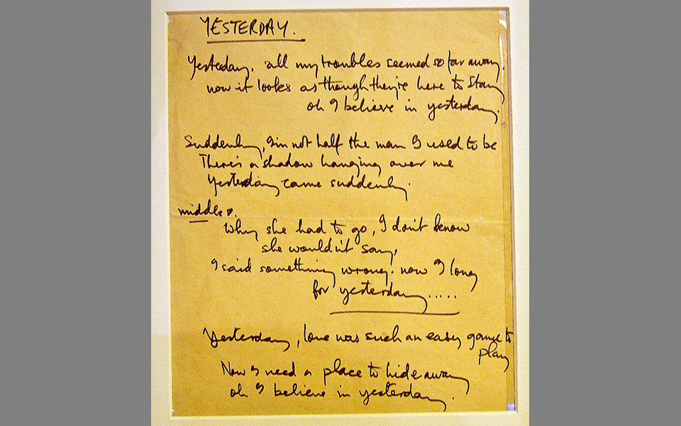 Στο βιβλίο του τα τραγούδια είναι ταξινομημένα αλφαβητικά. Παρουσιάζονται στίχοι και οι περιστάσεις στις οποίες γράφτηκαν, οι άνθρωποι και οι τόποι που τον ενέπνευσαν, αλλά και τι πιστεύει γι’ αυτούς τους στίχους σήμερα. Στην έκθεση, ανάμεσα στα αντικείμενα παρουσιάζονται και οι πρόχειροι στίχοι του «Hard day’s Night» γραμμένοι στην πίσω όψη μιας κάρτας γενεθλίων. Το συγκινητικό, όμως, είναι ότι και στις δύο περιπτώσεις μπορεί κανείς να ανακαλύψει τις λογοτεχνικές επιρροές του Πολ Μακάρτνεϊ, ανάμεσα στις οποίες είναι ο Σαίξπηρ, ο Κάρολος Ντίκενς καθώς και η Βιρτζίνια Γουλφ.