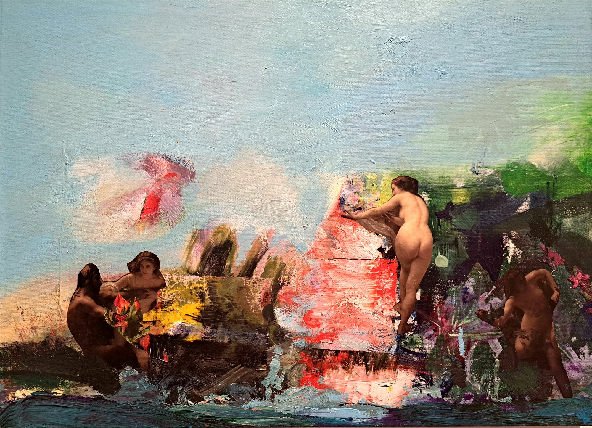 Σε αυτήν την έκθεση παρουσιάζει το αποτέλεσμα μιας εντατικής ζύμωσης με τα πράγματα που αγαπά. Εξπρεσιονιστικοί ουρανοί και στερεώματα γεμίζουν το βλέμμα μας λεπτοκεντημένοι με κολλάζ και σπαράγματα, με φιγούρες της ιταλικής αναγέννησης και του μπαρόκ, με την αινιγματική μορφή της Κόμισσας d’ Haussonville από τον διάσημο πίνακα του Ενγκρ, με το πρωινό στην εξοχή του Μανέ, με τη βυθισμένη στην ανάγνωση γυναίκα του Φραγκονάρ. Ο κόσμος της, αυτόφωτος και διαρκώς εφευρετικός, χωνεύει αυτά τα σπαράγματα δανείων και τα περιδινίζει μέχρι τελικής αφομοιώσεως. Τα εκβάλλει μετουσιωμένα αλλά διακριτά στη δική της χώρα της δημιουργίας. Τα παραδίδει σχολιασμένα, με χιούμορ, επενδεδυμένα με τη σαγήνη της μεταποίησης, της ανακύκλησης, της διάσπασης κάθε σοβαροφάνειας και γραμμικού κανόνα.