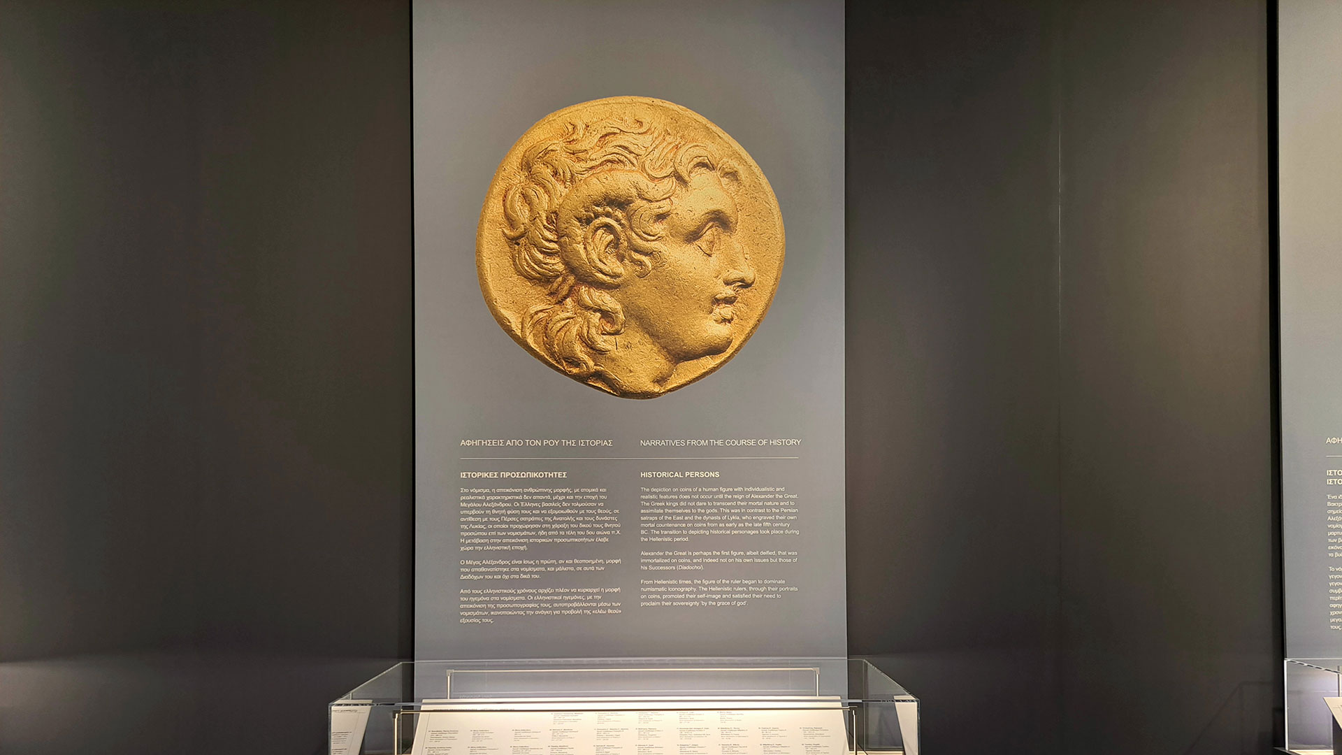 Η ξενάγηση από τη νομισματολόγο και επιμελήτρια της νομισματικής συλλογής της Alpha Bank, δρα Δήμητρα Τσαγκάρη, ήταν αποκαλυπτική όχι μόνο του πλούτου και της μοναδικότητας της συλλογής, αλλά και της στόχευσης αυτής της έκθεσης. Αριστουργήματα τέχνης, τα νομίσματα, έργα ανώνυμων χαρακτών, αφηγούνται με εναλλακτικό τρόπο την ιστορία των ηγεμόνων, της γεωπολιτικής ισορροπίας, του συμβολισμού της ισχύος. Ιδίως τα νομίσματα με τις μορφές βασιλέων και ηγεμόνων, αρχής γενομένης με τον Μέγα Αλέξανδρο (θεοποιημένος με τη μορφή Αμμωνος Διός, σε αργυρό τετράδραχμο Πτολεμαίου Α΄, π. 320 π.Χ.), είναι και μοχλοί προπαγάνδας.