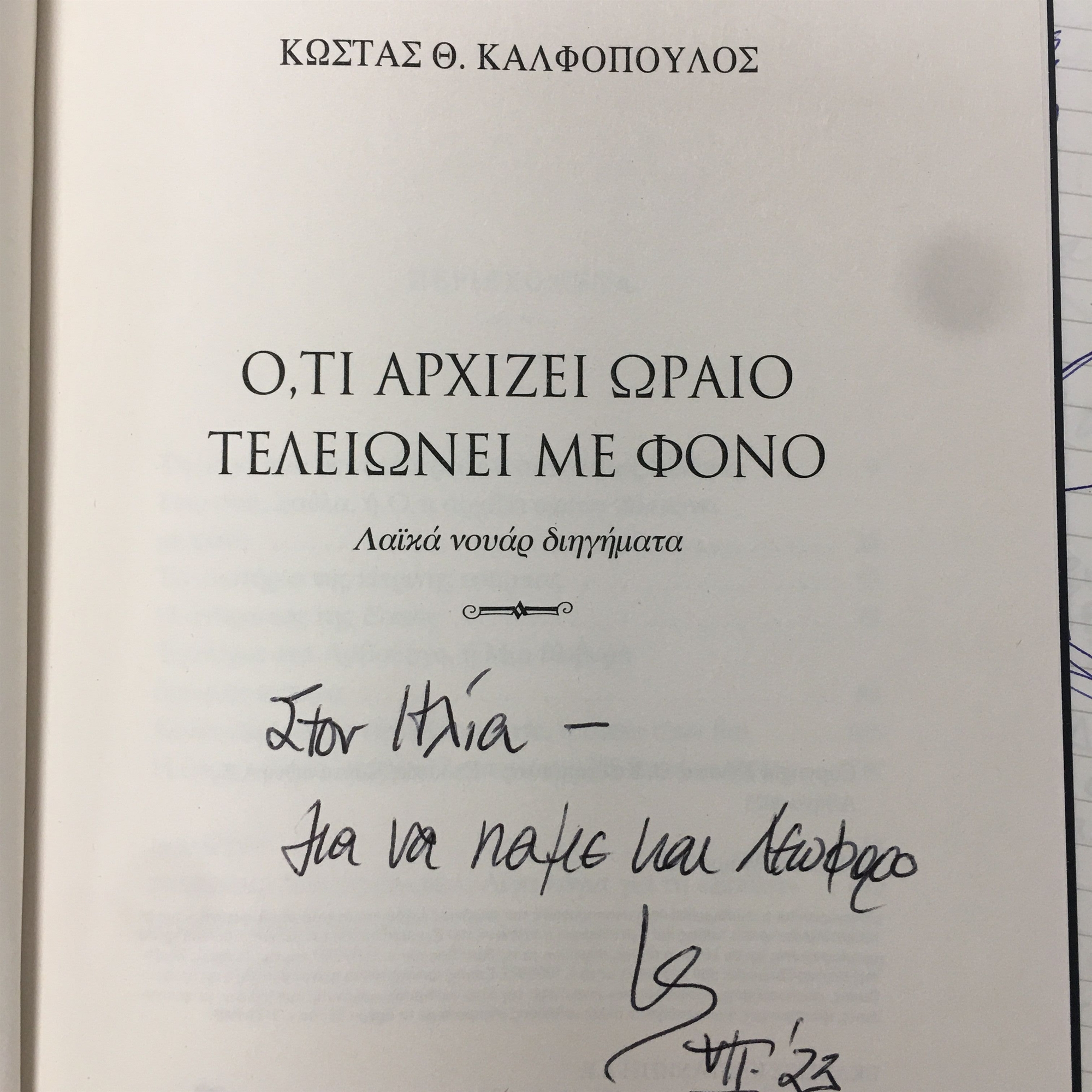 Χαμογέλασα όταν άνοιξα το βιβλίο, ανύποπτος για τη δραματική περιπέτεια στην οποία είχε μπει τις τελευταίες ημέρες ο συγγραφέας (πολύ πρόσφατα τον είχα πετύχει στη Σκουφά, όπου συνήθως τον πετύχαινα, κι έδειχνε δυνατός, όπως και άλλοτε…). Κοίταξα την αφιέρωση: «Στον Ηλία – για να πάμε και Λεωφόρο VII. ’23».