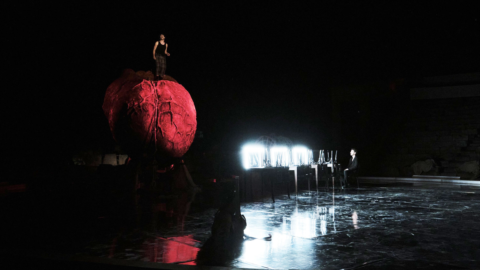 Η νύχτα έχει πέσει για τα καλά στο αργολικό θέατρο. Τα «Βατράχια» της Εφης Μπίρμπα βρίσκονται στο δεύτερο μέρος τους και μια πελώρια κόκκινη καρδιά έχει πια αποκαλυφθεί στο σημείο όπου λίγο νωρίτερα βρισκόταν σκεπασμένη η σκευή του Διονύσου και του Ξανθία, ταξιδιωτών στον Αδη για χάρη της Ποίησης. Ο Ξανθίας του Μιχάλη Σαράντη ξεκινά ένα ερωτικό κάλεσμα με… μαθηματικές πράξεις προς την Πλαθάνη της Μαίρης Μηνά. Ολα τα αποτελέσματα είναι εξωφρενικά «λάθος», όμως, ως γνωστόν, δεν υπάρχει σωστό και λάθος στον έρωτα. «Τι ωραία που μετράς», του λέει εκείνη. Η μαγεία του κόσμου με τον οποίο έχουν ντύσει η Εφη Μπίρμπα και οι συνεργάτες της τους αριστοφανικούς «Βατράχους» φτάνει σε αυτό το σημείο στο απόγειό της, είναι μια στιγμή σχεδόν απλοϊκή αλλά πανέμορφη.